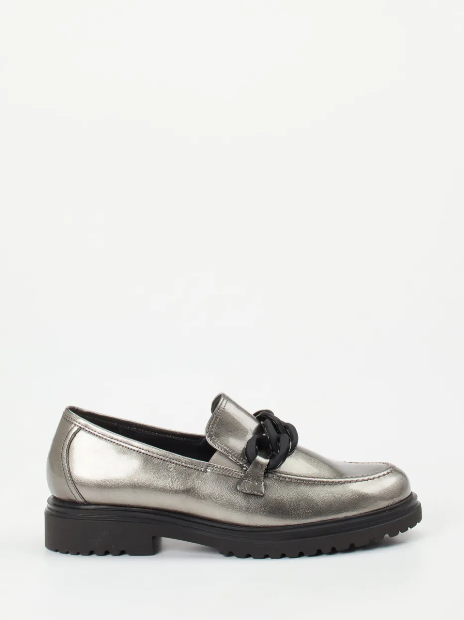 Glänzender Auftritt mit Komfortweite.Gabor Comfort liefert mit diesem Damen-Loafer ein modisches Statement für Alltag und Büro. Das Modell überzeugt durch hochwertiges Lackleder mit glänzender Oberfläche in coolem Metallicgrau. Eine markante Kunststoffkette in Schwarz akzentuiert die klassische, flache Silhouette mit leichtem Blockabsatz. Die profilierte Gummisohle bietet Rutschhemmung und angenehme Stabilität. Dank Komfortweite H und Leder-/Textilfutter eignet sich der Schlupfschuh ideal für trendorientierte Trägerinnen, die Wert auf Bequemschuhe mit Stil legen. Der Look ist inspiriert von aktuellen Metallic-Accents-Trends und perfekt kombinierbar mit schmalen Stoffhosen oder Oversize-Blazern. Lässige Eleganz mit Gabor-Komfort – stilvoll und alltagstauglich.