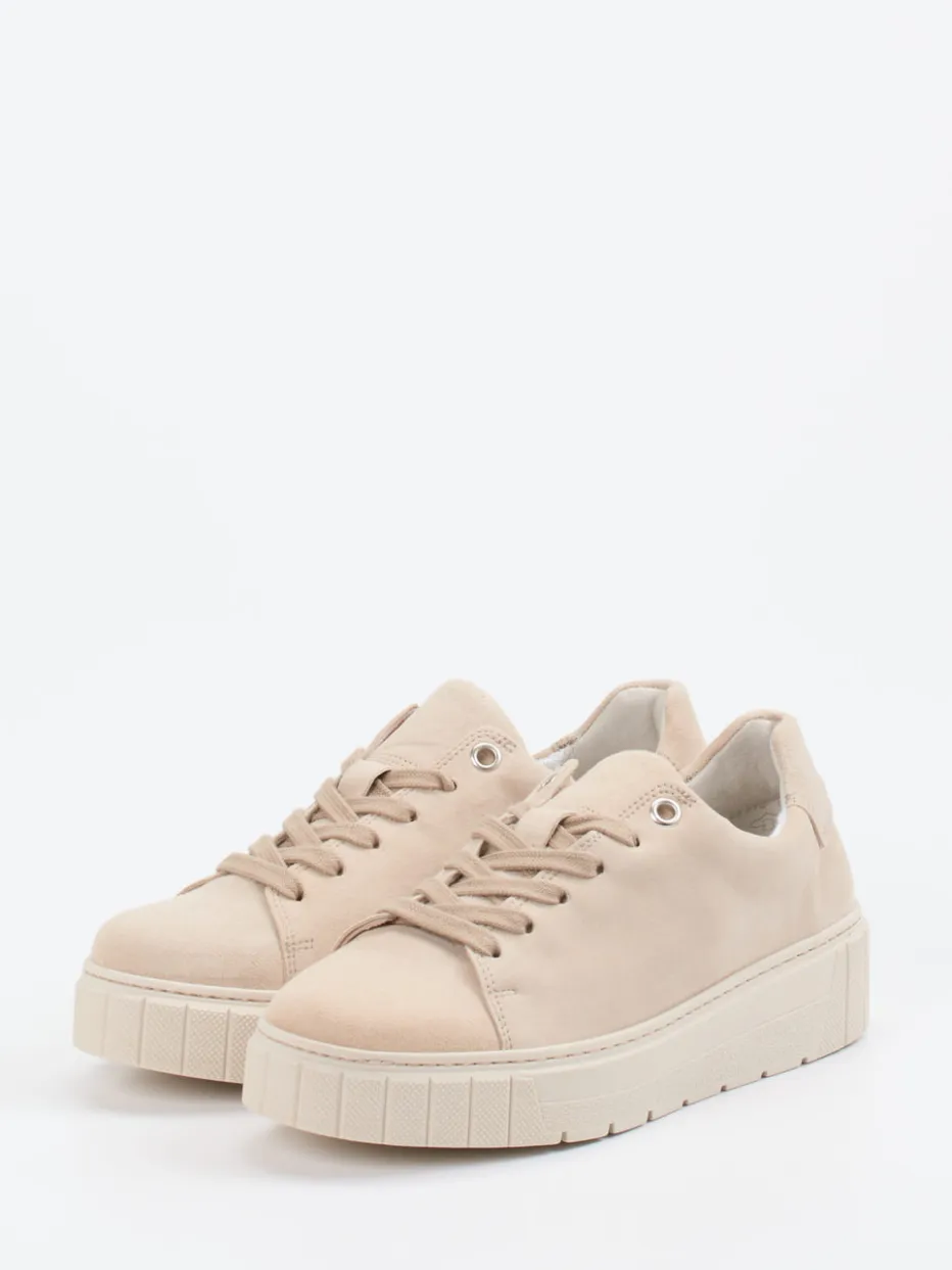 Beiger Klassiker im aktuellen Plateau-Look.Dieser Sneaker von Gabor Comfort gehört zur Damenlinie und überzeugt mit alltagstauglichem Design. Ob beim Stadtbummel oder im entspannten Freizeitsetting – das beigefarbene Veloursleder mit samtig-matter Oberfläche sorgt für eine stilvolle, dezente Optik. Die leicht erhöhte, voluminöse Plateausohle aus cremefarbenem Gummi ist rutschhemmend profiliert und wirkt durch die Rundsilhouette besonders harmonisch. Ton-in-Ton-Nähte und silberfarbene Ösen unterstreichen den minimalistischen Chic. Innen überrascht ein Frottee-Futter mit angenehmer Haptik, während das Wechselfußbett zusätzlichen Komfort bietet. Im urbanen Kontext mit Crossbody-Bag und Jogpants kombinierbar. Ein durchdachter Komfortschuh mit unaufdringlicher Trendaffinität – typisch Gabor Comfort.