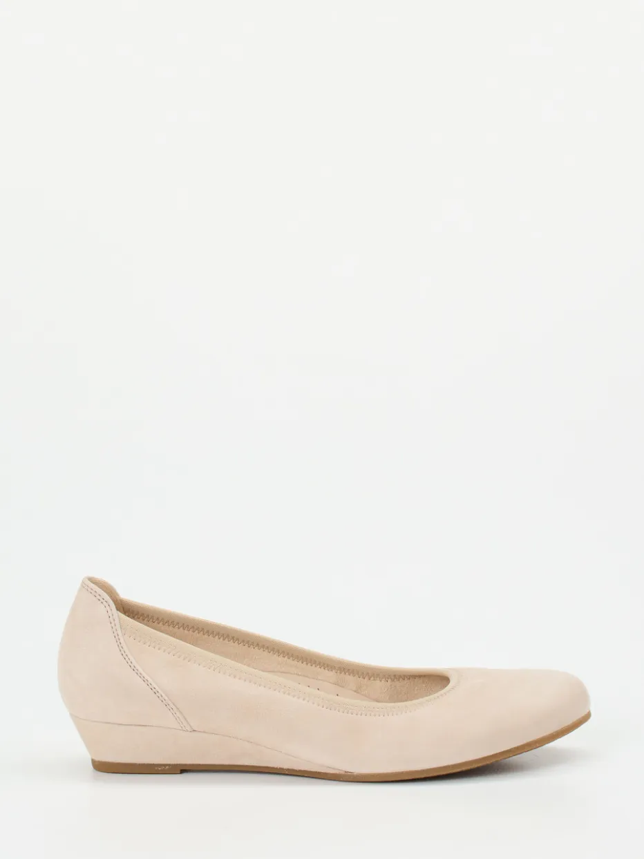 Mit diesem Keilpumps der Marke Gabor Comfort laufen Sie wie auf Wolken! Das beige Veloursleder des Modells Kreta, hier in der Weite G, ist wunderbar weich. Der leicht elastische Einfass sorgt für optimalen Halt. Der lederbezogene Keil hat eine angenehme Höhe. Sehr flexibel ist die unkomplizierte Gummisohle.