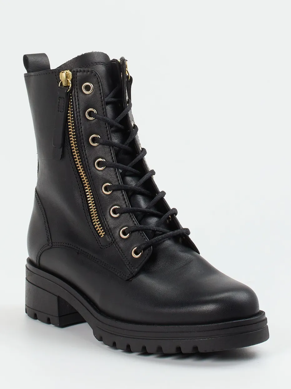 Diese Stiefelette vereint urbanes Design mit Funktionalität: robustes Kalbleder, präzise Schnürung und goldene Reißverschlüsse sorgen für Komfort und Stil im Alltag.