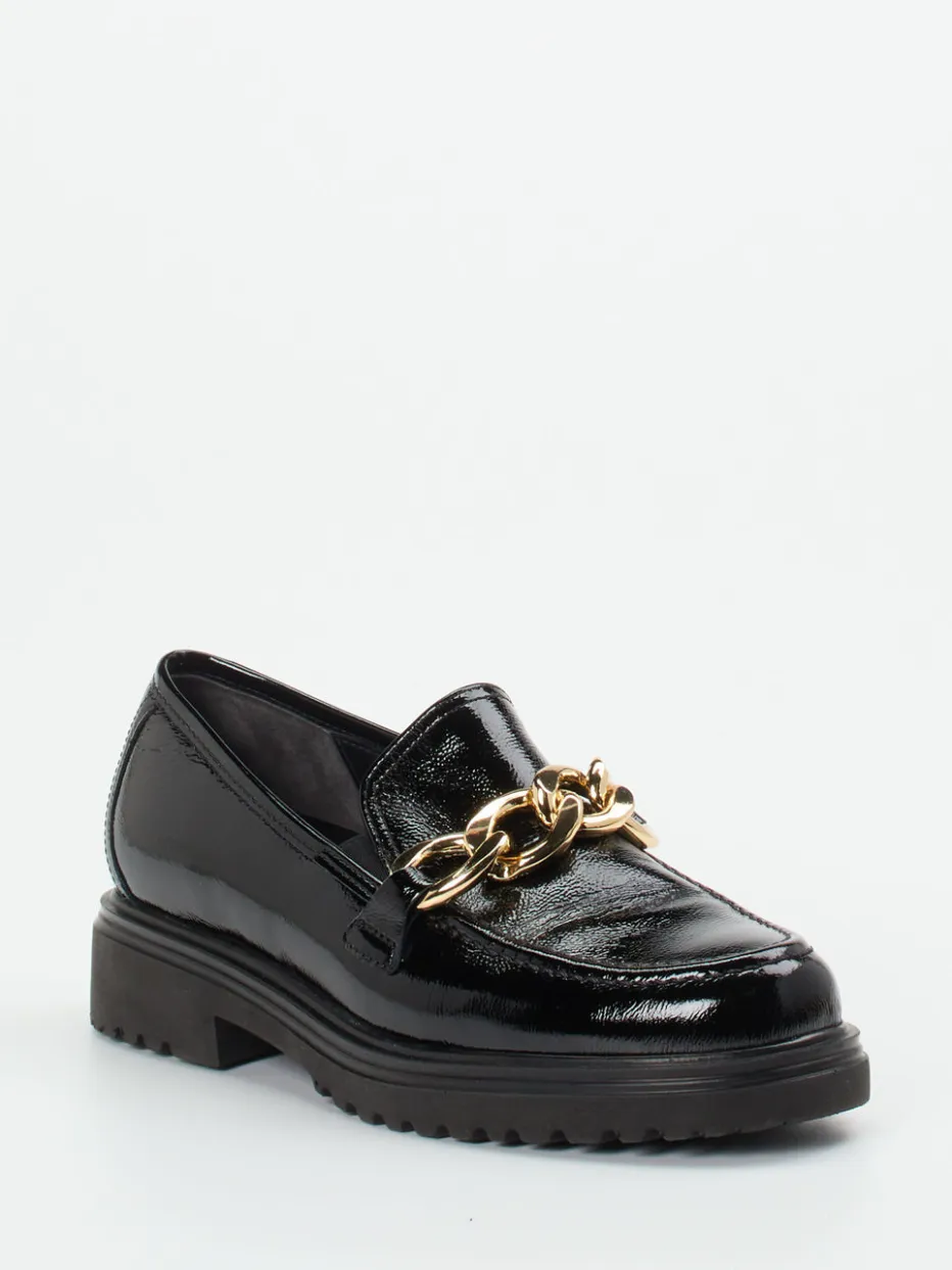 Glänzendes Lackleder trifft auf profilstarke Sohle und edles Kettendetail – ein stilbewusster Auftritt mit Komfortweite garantiert.