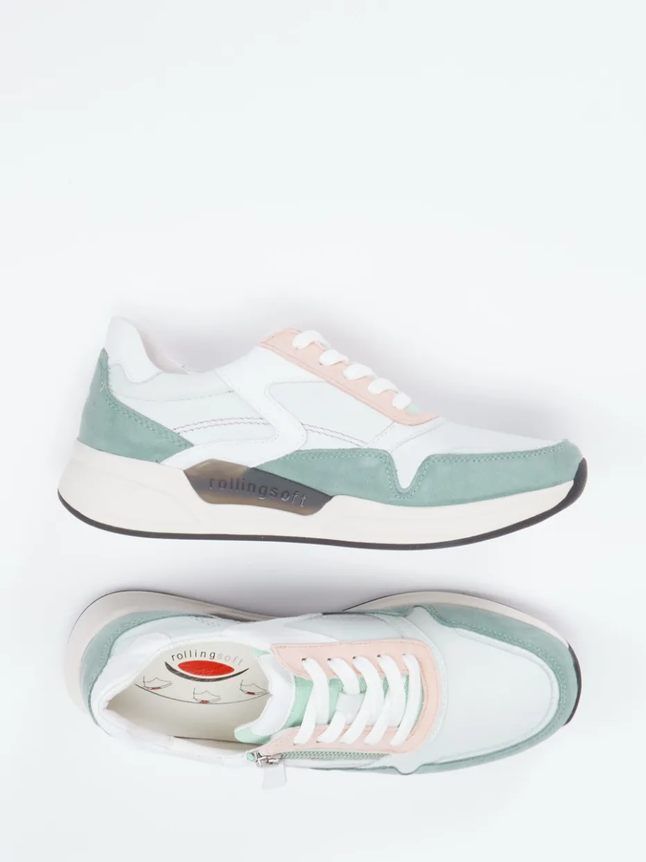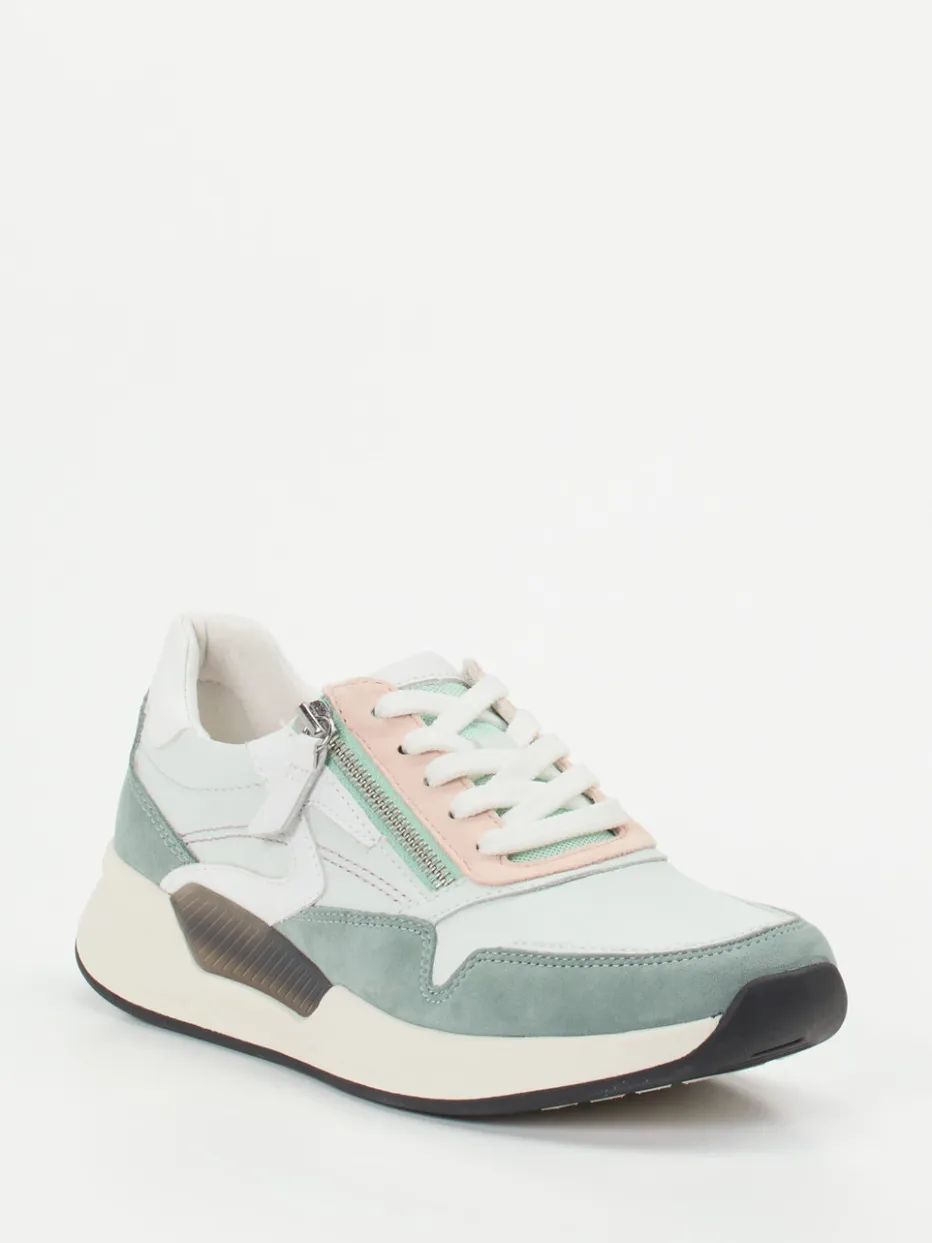 Perfekt für den Alltag: Das butterweiche Kalbleder mit samtigem Veloursleder setzt in Mintgrün, Rosé und Weiß zarte Akzente. Der sportlich-voluminöse Schnitt wird durch eine kontrastierende Gummisohle und weiche Polsterung ergänzt. Schnürung und Reißverschluss bieten flexible Weitenanpassung, das Wechselfußbett maximiert den Tragekomfort. Pastelltöne und Chunky-Form machen den Sneaker zum Frühlingshighlight für casual Looks.