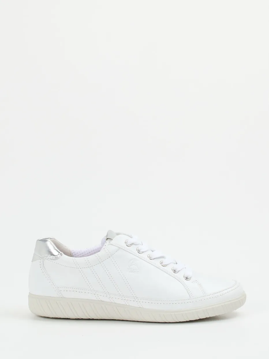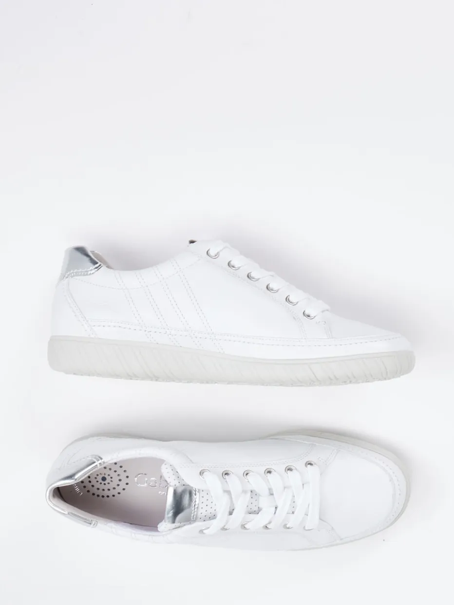 Cleanes Design trifft bequeme Verarbeitung.Gabor Comfort präsentiert einen weißen Damen-Sneaker mit klarem Fokus auf Komfort und Stil. Ob beim Stadtbummel oder an langen Arbeitstagen – dieser Schnürschuh überzeugt durch feines Kalbleder mit matter Oberfläche und silberfarbene Akzente an Ösen und verstärktem Fersenbesatz. Die klassische Form mit flacher Sohle aus flexiblem PU sorgt für ein angenehmes Tragegefühl und sicheren Halt. Innen bietet ein hochwertiges Hightech-Mesh-Futter Atmungsaktivität, während die gepolsterte Einlegesohle austauschbar ist. Minimalistische Linienführung und cleane Farbgebung machen ihn zum vielseitigen Kombipartner für sportlich-legere Looks. Bequemer Stil von Gabor Comfort trifft urbanen Purismus.