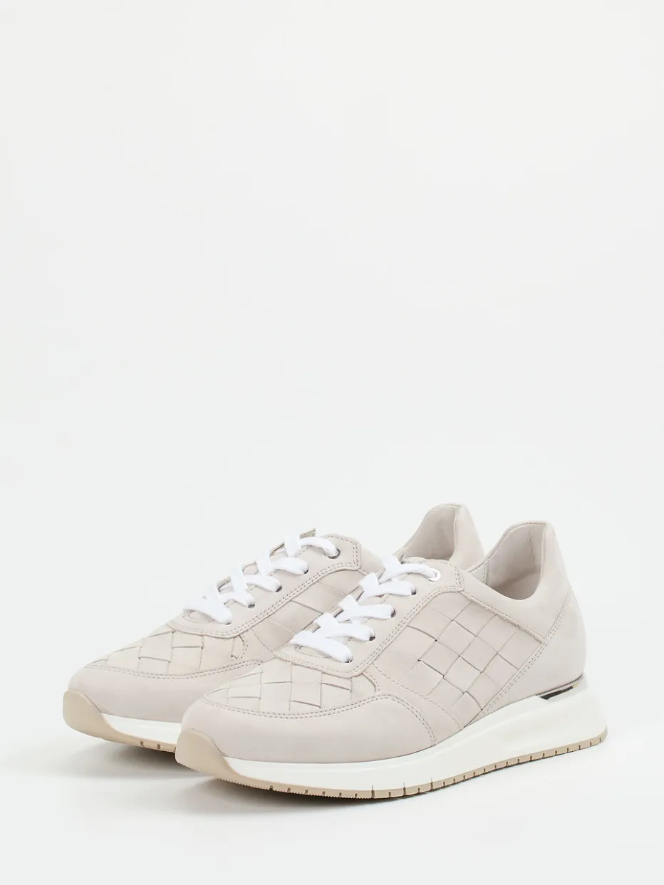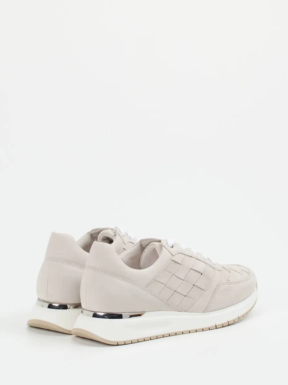 Ob Stadtspaziergang oder Wochenend-Ausflug – das weich gearbeitete Nubukleder in hellem Beige mit samtigem Finish und geflochtener Struktur wirkt besonders hochwertig. Eine weiße Gummisohle mit Profil, gepolsterter Schaftrand sowie ein herausnehmbares Komfortfußbett sorgen für angenehmes Tragen. Metallische Details an der Ferse setzen moderne Akzente. Die klassisch-sportliche Form passt ideal zum Quiet-Luxury-Trend.