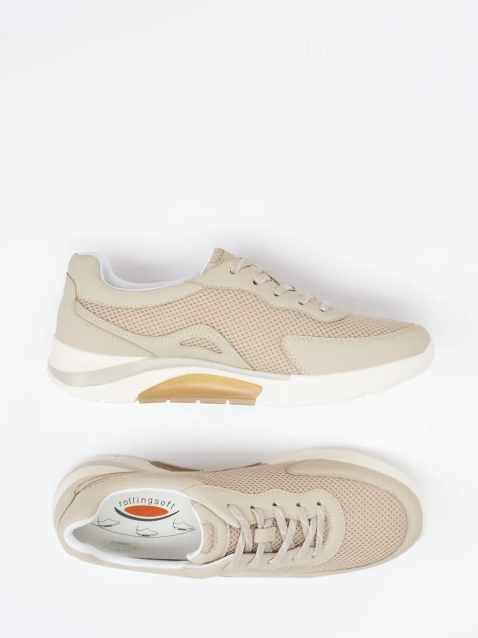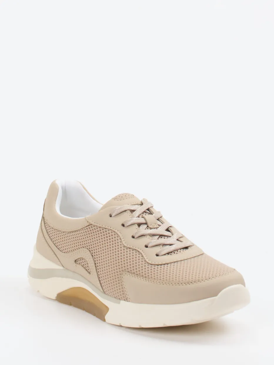 Komfort trifft Leichtigkeit.Gabor Comfort präsentiert einen sportlich-bequemen Sneaker für Damen, gefertigt aus hochwertigem Textil und attraktiv gemustertem Mesh. Ob beim Bummeln oder unterwegs im Alltag – der beigetönige Komfort-Sneaker mit mattierter Oberfläche sorgt dank ergonomischer Laufsohle, gepolsterter Schaftränder und atmungsaktivem Innenmaterial für ein angenehmes Tragegefühl. Die Ton-in-Ton-Gestaltung, die sportlich-abgerundete Silhouette sowie transluzente Details an der Sohle wirken modern und dezent zugleich. Das herausnehmbare, lederbezogene Memory-Foam-Fußbett rundet die flexible Funktionalität ab. Ideal kombinierbar zu entspannten Casual-Outfits in Naturtönen. Zuverlässiger Komfort in moderner Zurückhaltung – typisch Gabor Comfort.
