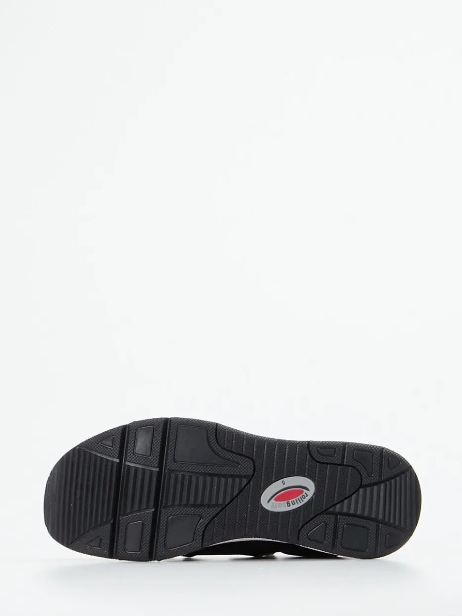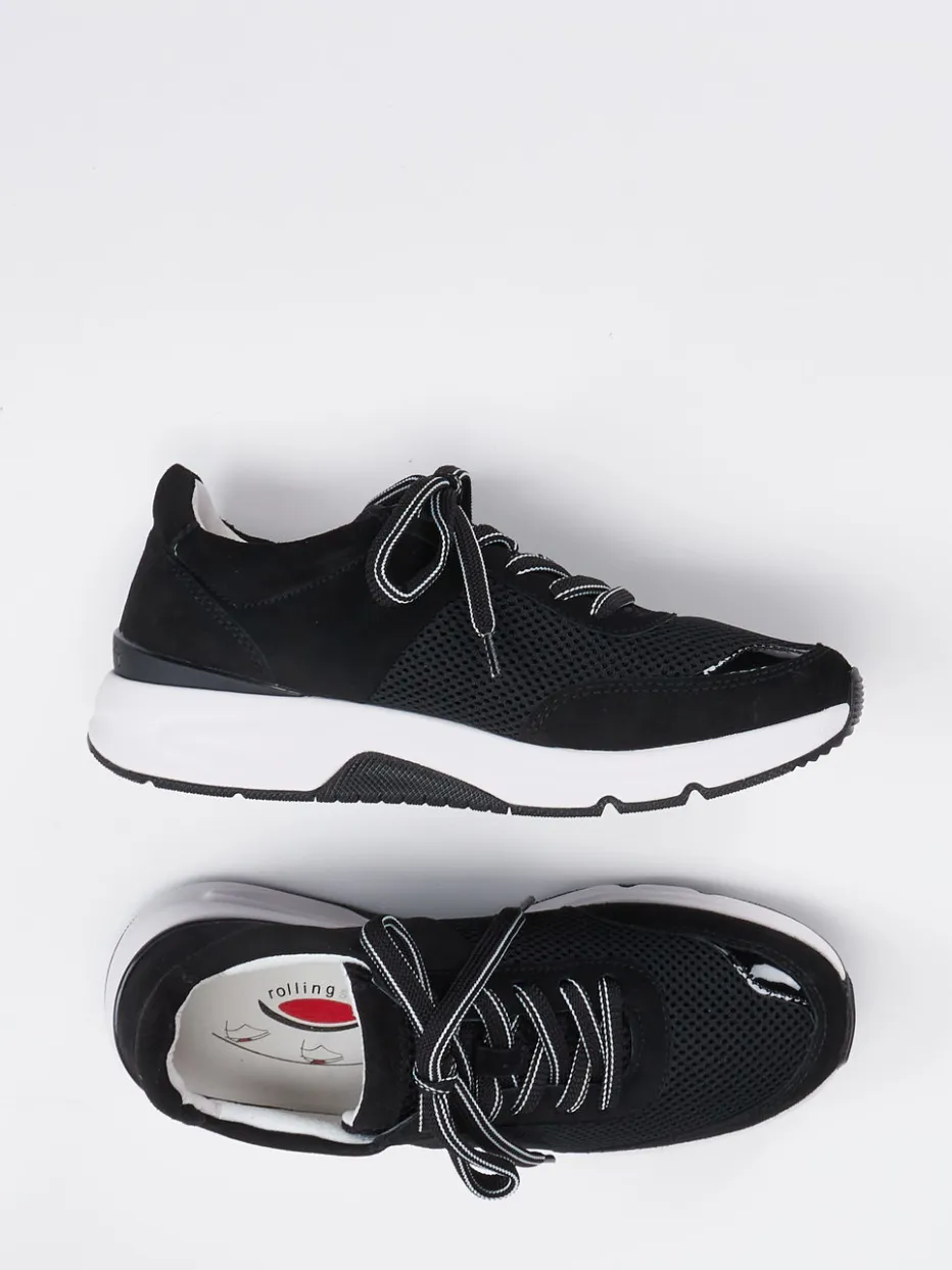 Sportlichkeit trifft Komfort.Gabor Comfort präsentiert mit diesem Damen-Sneaker ein Modell der Serie Rollingsoft für anspruchsvolle Alltagsmomente. Die Kombination aus tiefschwarzem Veloursleder und tonigem Mesh verleiht dem Schuh eine matte, edle Ausstrahlung – unterstützt von kontrastierender Zweifach-Schnürung und einer abgerundeten, sportlichen Silhouette. Die weiße Gummisohle mit ergonomischem Aufbau sorgt für ein dynamisches Abrollen, während gepolstertes Innenfutter und Wechselfußbett exzellenten Komfort schaffen. Weiß gesetzte Kontrastnähte und die Logo-Prägung an der Ferse verleihen ein dezentes Markensignal. Streetwear- und Athleisure-Einflüsse machen ihn zum Allrounder für cleane Casual-Looks. Gabor Comfort verbindet funktionale Innovation mit zurückhaltendem Stilgefühl.