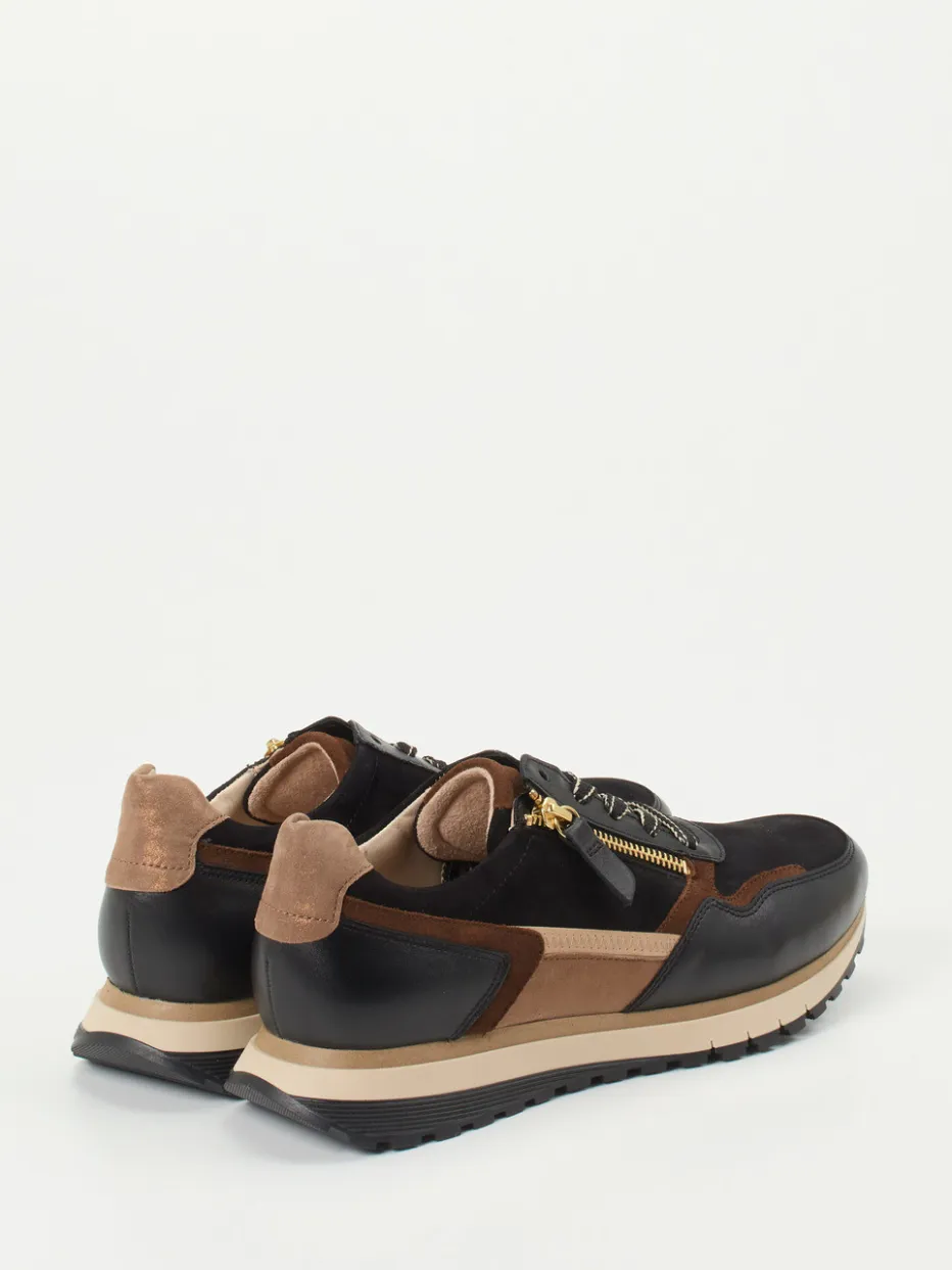 Komfort trifft Stil in Schwarz.Gabor Comfort bringt mit diesem Damen-Sneaker eine sportiv-elegante Option in Weite H auf den Markt. Ideal für entspannte Alltagssituationen vereint das Obermaterial aus samtig angeschliffenem Veloursleder in Schwarz mit Details aus Glattleder sowie Akzenten in Mittel- und Beigebraun hohen Tragekomfort mit Chic. Die Kombination aus goldfarbenem Reißverschluss und zweifarbiger Schnürung sorgt für Funktionalität und Designtiefe. Eine dämpfende Gummisohle mit rutschhemmendem Profil unterstützt das natürliche Abrollen. Der Look orientiert sich am Retro Running Style und interpretiert ihn modern. Ein funktionaler Sneaker mit bequemem Mehrwert und dezentem Streetwear-Appeal.