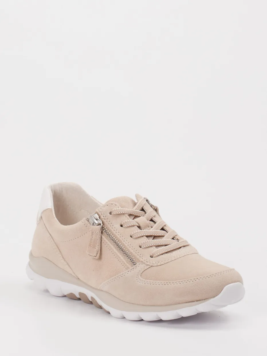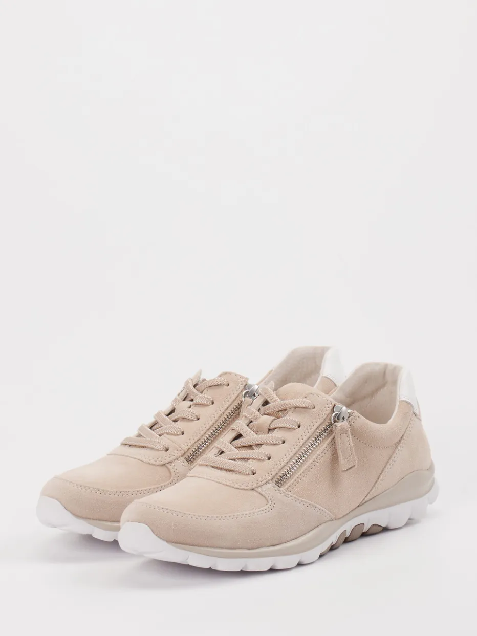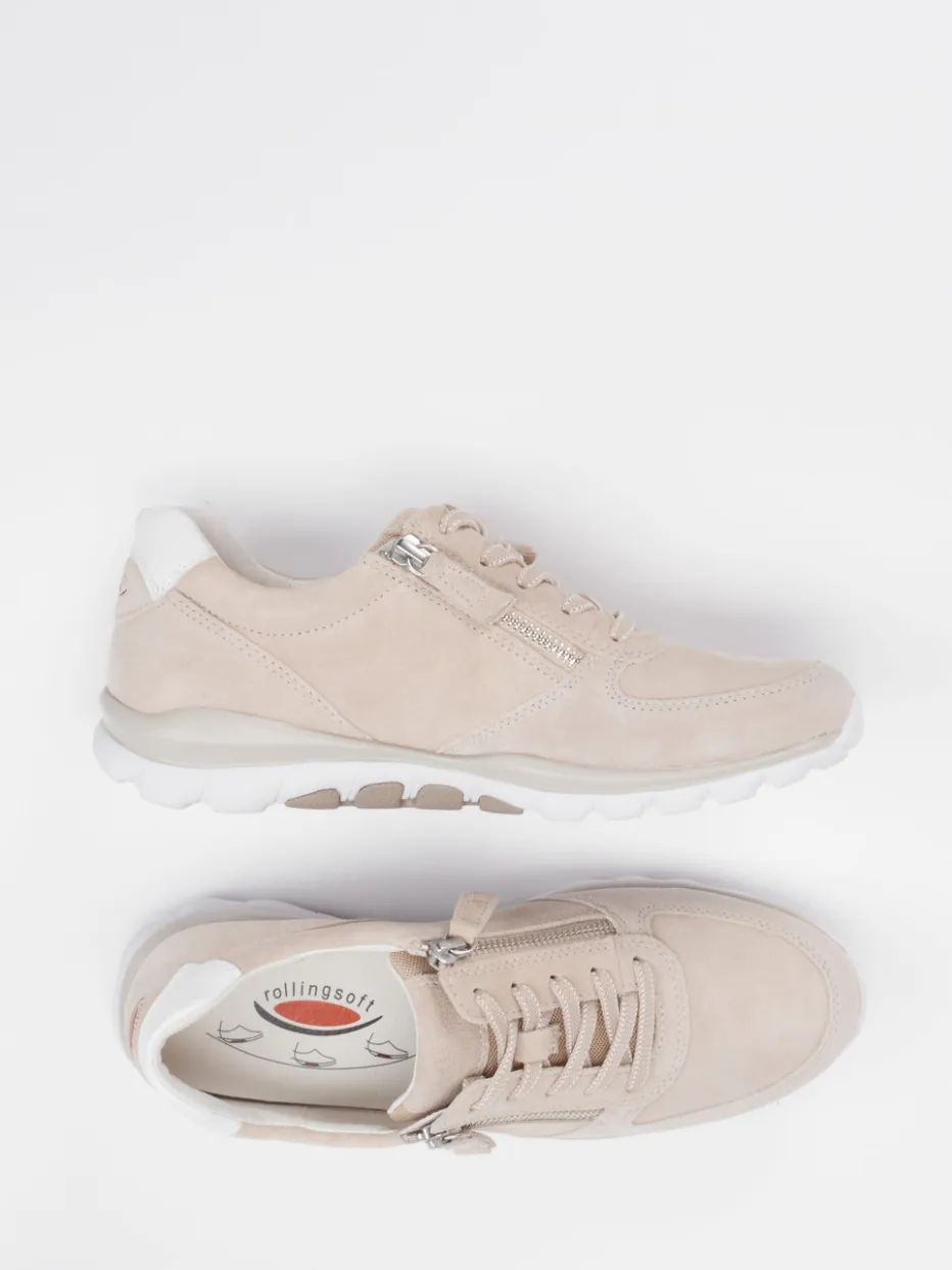 Ideal für aktive Alltage oder entspannte Wochenenden bietet der Schuh mit hochwertigem Veloursleder in einem sanften Beigeton ein angenehm softes Tragegefühl. Die klassisch flache Silhouette, kombiniert mit matter Oberfläche und weißen Kontrastdetails an der Ferse, verleiht dem Schuh ein dezentes, modernes Finish. Ausgestattet mit seitlichem Reißverschluss, Schnürung und der stoßdämpfenden Rollingsoft-Sohle zeigt sich der Sneaker von seiner praktischen Seite. Passt hervorragend zu Casualwear in neutralen Tönen.