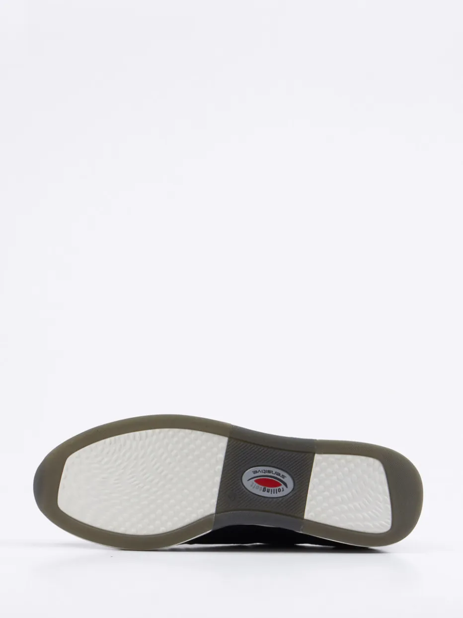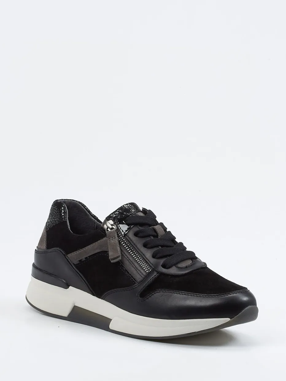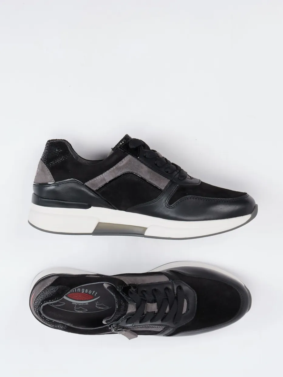 Sportlicher Komfort trifft Materialmix.Gabor Comfort präsentiert einen vielseitigen Sneaker für Damen. Der Schuh erfüllt gleich mehrere Ansprüche urbaner Mode: Die Kombination aus schwarzem Veloursleder, feinem Kalbleder und dezentem Lackleder verleiht ihm eine klare, hochwertige Anmutung. Die matt-genarbte Struktur, Reißverschlussdetails und ein feines Schlangenprägungs-Element an der Ferse unterstreichen die raffinierte Gestaltung. Ergänzt wird das Design durch eine grau-weiße Gummisohle mit Rollingsoft-Technologie, die für dynamischen Laufkomfort sorgt. Das herausnehmbare Fußbett macht ihn einlagengeeignet – besonders wertvoll für Komfortliebhaberinnen. In Schwarz gehalten, passt dieser Low-Top Sneaker zu monochromen Looks und reduziertem Winterlayering. Gabor Comfort steht für durchdachte Passform und dezente Eleganz im sportiven Alltag.