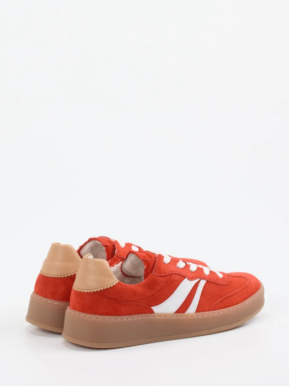 Retro-Charme trifft Komfort.Gabor Comfort interpretiert den klassischen Sneaker in einem außergewöhnlichen Retro-Design neu. Ob für ausgedehnte Spaziergänge in der Stadt oder entspannte Urlaubsmomente: Das weiche Veloursleder, samtig angeschliffen, steht zusammen mit einem soften Microfaserfutter und gepolstertem Wechselfußbett für angenehmen Tragekomfort. Auffälliges Tomatenrot trifft auf weiße Kontraststreifen und eine beigefarbene Fersenkappe mit Zackenabschluss. Die flache Honig-Gummisohle ergänzt den Look im Stil der Retro-Sportswear und sorgt für sicheren Halt. Die klassische Low-Top-Form lässt sich vielseitig zu Jeans oder Shorts kombinieren. Ein modischer Begleiter mit Wohlfühlfaktor – typisch Gabor Comfort.