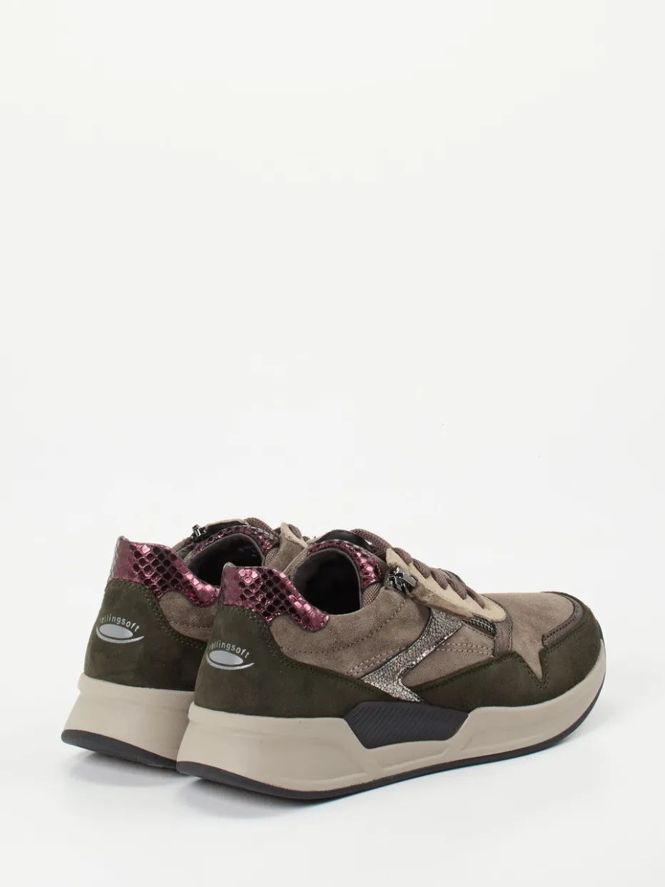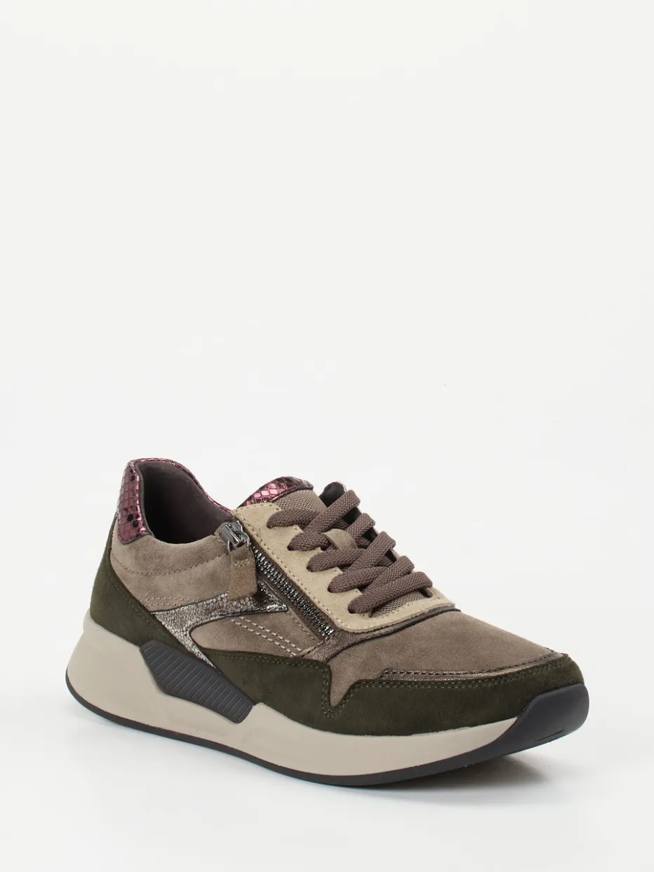 Design trifft Funktion: Komfort neu interpretiert.Der Damen-Komfort-Sneaker von Gabor Comfort vereint modischen Anspruch mit funktionalen Details. Taupefarbenes Veloursleder sorgt in Kombination mit olivgrünen Textilpartien und brombeerfarbenen Metallic-Overlays in Schlangenoptik für einen stilvoll-herbstlichen Auftritt. Die klassisch-sportliche Silhouette mit Kontrastnähten, Reißverschluss und gepolstertem Schaftrand bietet alltagsfreundlichen Komfort. Unterstützt wird das angenehme Tragegefühl durch das wechselbare Fußbett und die Rollsohlen-Gummisohle mit Fersendämpfung. Ein idealer Begleiter für Freizeitaktivitäten mit Anspruch an Komfort und Stil. Gabor Comfort steht für moderne Bequemlichkeit mit hochwertigem Materialmix.