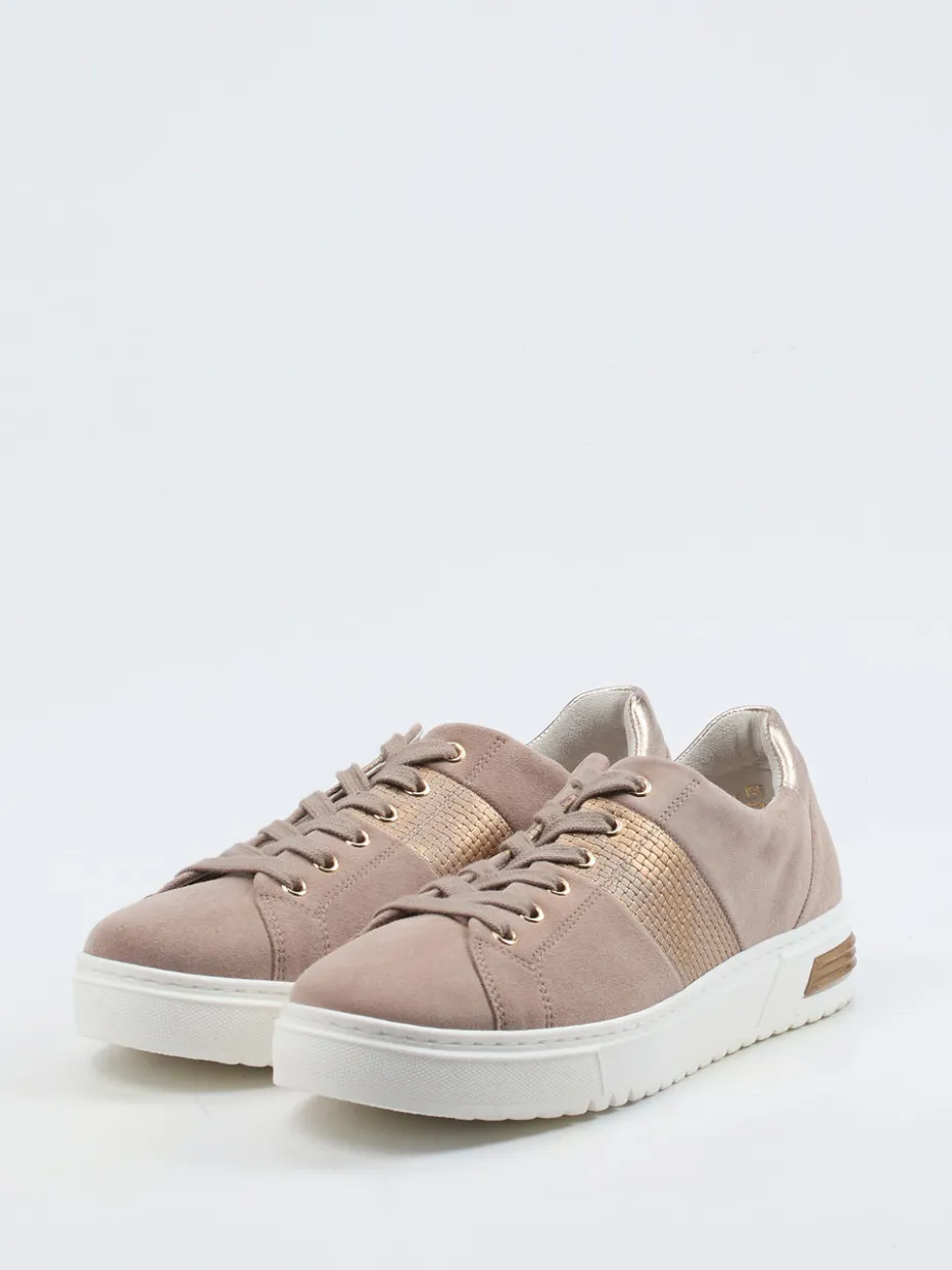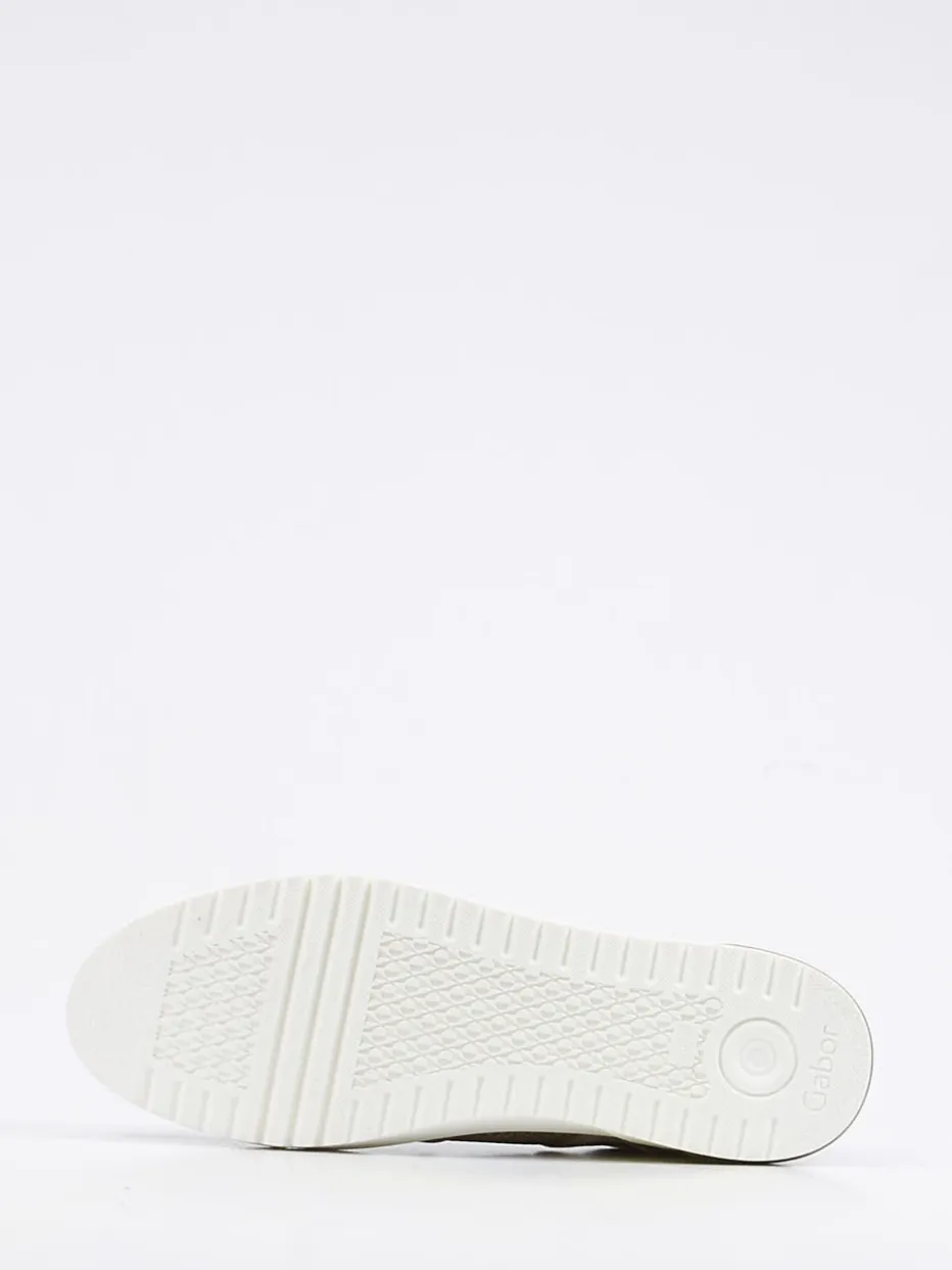 Feiner Komfort für moderne Freizeitlooks.Gabor Comfort zeigt diesen Damen-Sneaker aus der Linie „Davos“ in beigem Veloursleder mit roséfarbenem Unterton. Perfekt für entspannte Tage, kombiniert der Schuh softes Veloursleder mit gewebten Metallic-Details und einem glänzenden Fersenelement in Gold. Der klassische Schnitt mit Schnürung und komfortabler Weite H sorgt für ein angenehmes Tragegefühl. Die weiße, profilierte Gummisohle rundet das Modell alltagstauglich ab. Rosébeige und Gold liegen im Trend und lassen sich vielseitig zu Pastelltönen oder neutralen Casual-Looks kombinieren. Gabor Comfort steht für stilsicheres Design mit Wohlfühlvorteil.