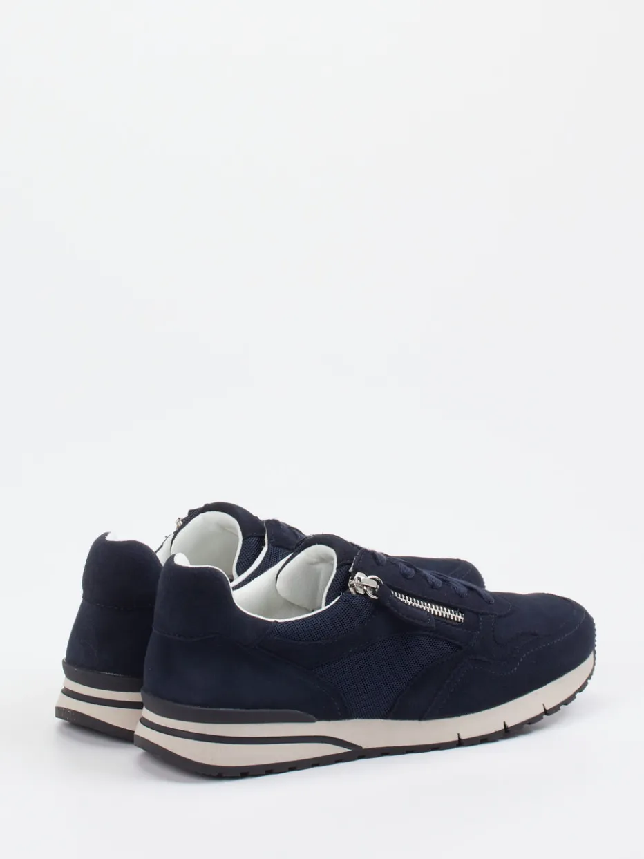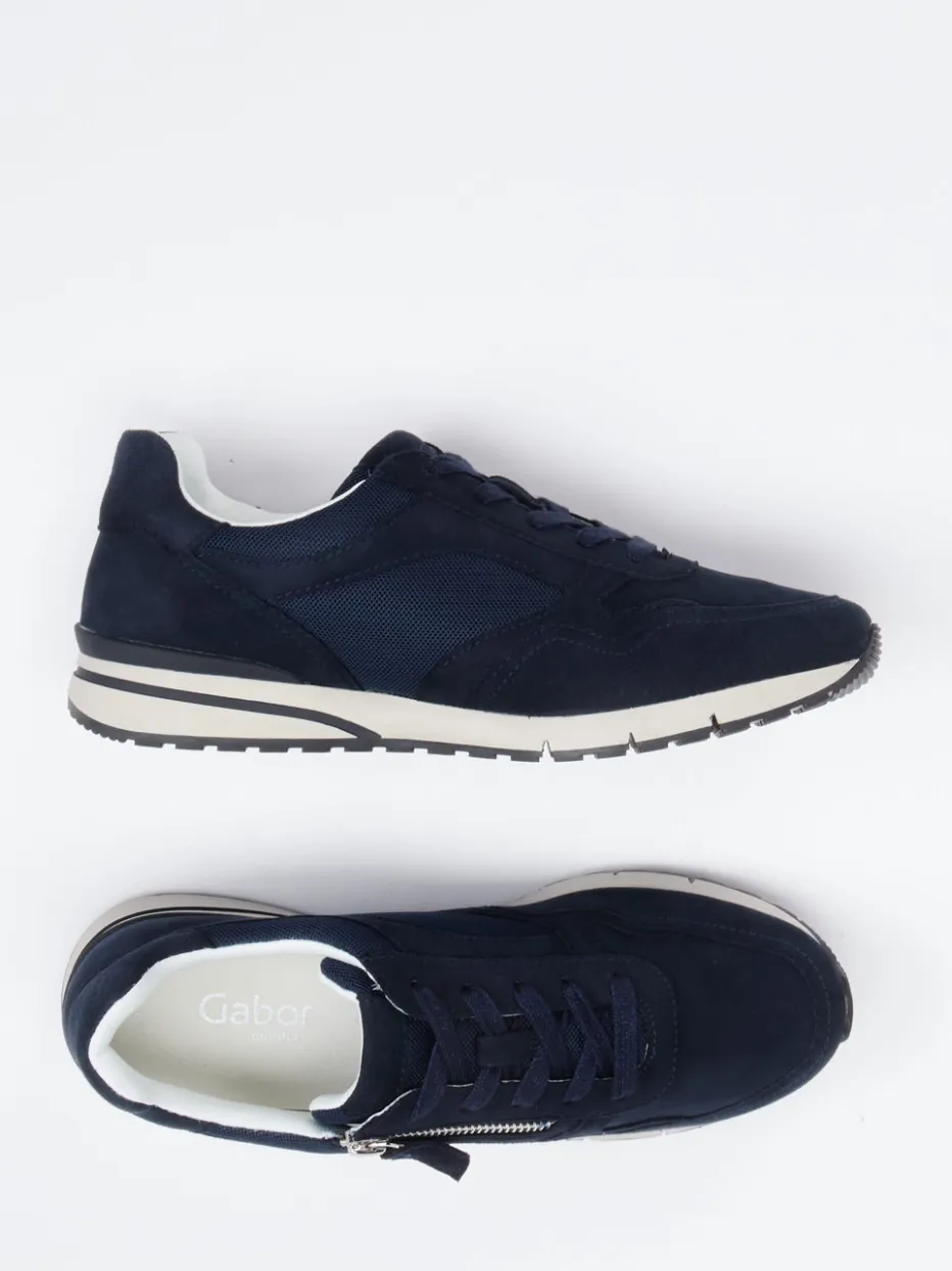 Sportlicher Komfort für jeden Tag.Gabor Comfort zeigt mit diesem Damen-Komfortsneaker, wie moderne Lässigkeit und Funktionalität harmonieren. Für entspannte Freizeitmomente bietet dieser Sneaker durch das Zusammenspiel von samtig angeschliffenem Veloursleder und luftdurchlässigem Mesh höchsten Tragekomfort. Der dunkelblaue Farbton unterstreicht den minimalistischen Look, während ein silberfarbener Reißverschluss und eine zweifarbige Kontrastsohle sportliche Akzente setzen. Die gepolsterte Ausstattung und das austauschbare Fußbett sorgen für zusätzliche Bequemlichkeit. Elemente aus der Streetwear treffen auf die Retro-Runner-Formensprache – ein Favorit für stilvolle Casual-Outfits. Perfekt zur Softshelljacke und Chino kombinierbar. Komfort und Alltagstauglichkeit stilvoll umgesetzt – typisch Gabor Comfort.