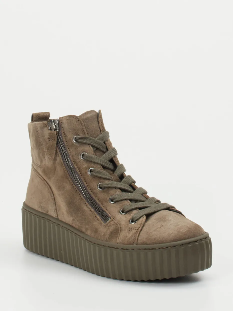 Utility-Ästhetik trifft Komfort.Gabor präsentiert einen Damen-Sneaker der Kategorie High-Top. Für entspannte City-Tage bei windigem Herbstwetter bietet dieses Modell ein gelungenes Zusammenspiel aus stilvoller Optik und Funktionalität. Gefertigt aus hochwertigem Veloursleder mit samtiger Haptik in Taupebraun und Khaki-Oliv, punktet der Sneaker mit einer tonalen Schnürung, seitlichem Reißverschluss und markanter Plateausohle. Die knöchelhohe Silhouette greift aktuelle Streetwear- und Chunky-Trends auf. Ideal kombinierbar mit Steppjacke oder Cordhose. Perfekte Wahl für urban orientierte Styles mit bequemer Basis.
