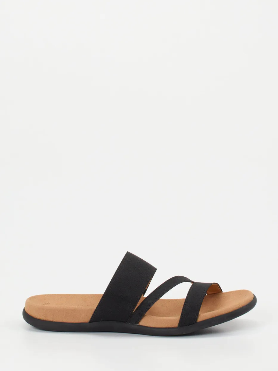 Leichtigkeit trifft Komfortdesign.Gabor präsentiert mit dieser Damen-Komfort-Pantolette einen stilvollen Begleiter für entspannte Freizeitmomente. Die flache, ergonomisch geformte Sohle und das samtmatte, schwarze Textilmaterial bieten zusammen mit dem lederbezogenen Best-Fitting-Fußbett ein besonders angenehmes Tragegefühl. Asymmetrisch verlaufende, elastische Riemen in Schlupfform sorgen für sicheren Halt, während Ton-in-Ton-Nähte und die strukturierte Gummisohle mit Markenprägung dezente Akzente setzen. Der puristische Look unterstreicht den minimalistischen Stilanspruch moderner Komfortmode. Ideal kombinierbar zu Leinenhosen oder sommerlichen Blusen. Ein funktionaler Sommerschuh mit dem Qualitätsversprechen von Gabor.