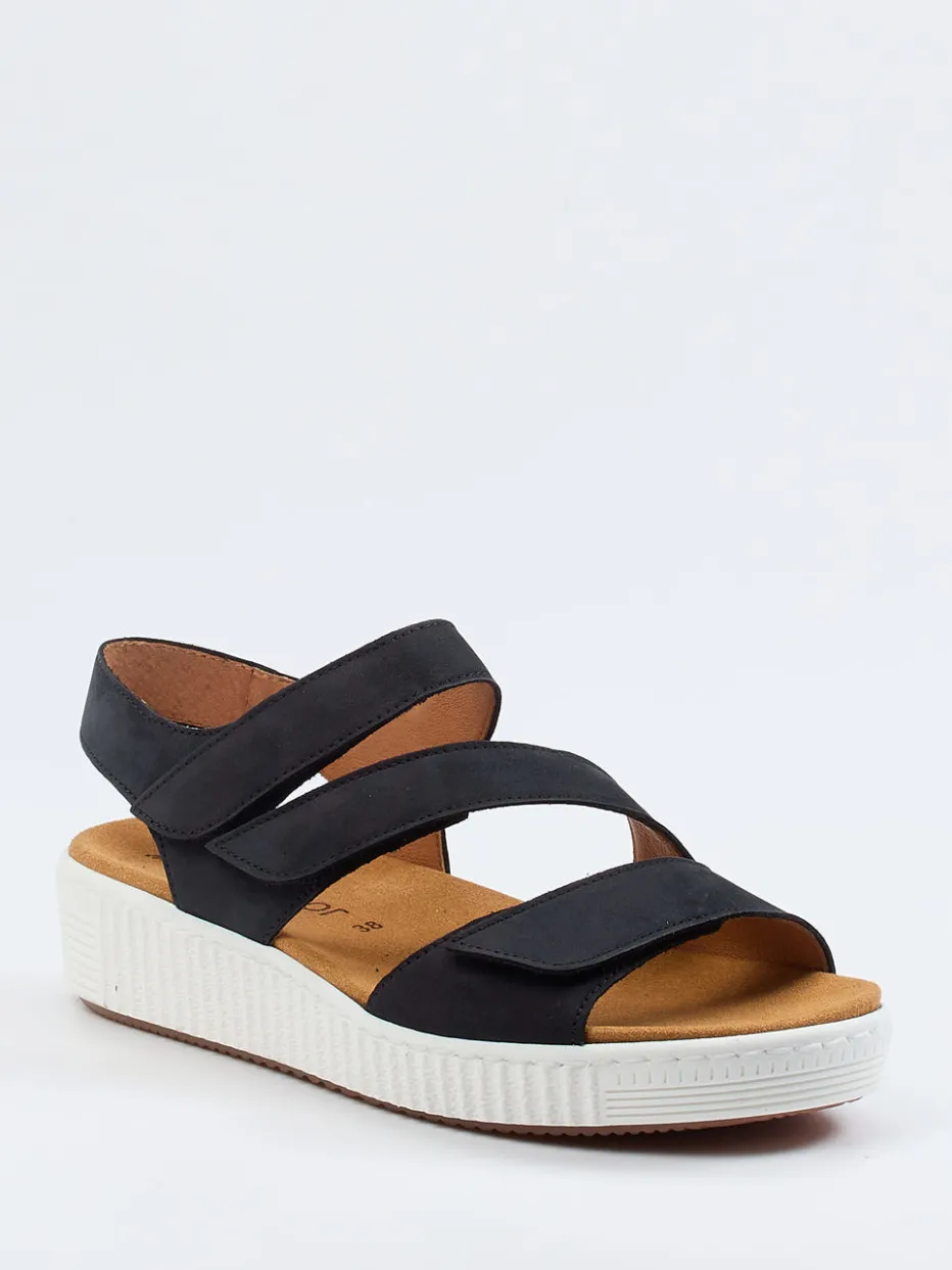 Diese sportliche und vielseitig kombinierbare Sandale präsentiert die Marke Gabor. Das dunkelblaue, angenehm weiche Nubukleder kommt auf den asymmetrisch angeordneten Riemchen schön zur Geltung. Für ein leichtes Handling und einen hervorragenden Sitz am Fuß sind die drei Riemchen mit Klettverschlüssen versehen. Die weiße, strukturierte Gummisohle setzt einen frischen Akzent und verspricht zugleich unkomplizierte Alltagstauglichkeit. Das anatomisch geformte Fußbett ist bei Bedarf herausnehmbar.