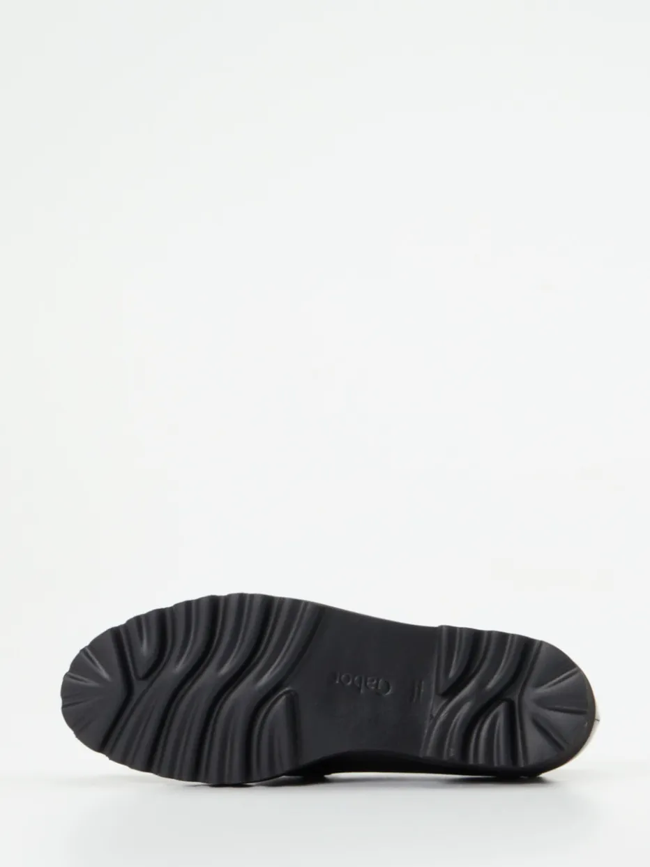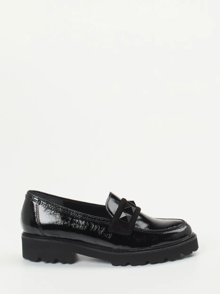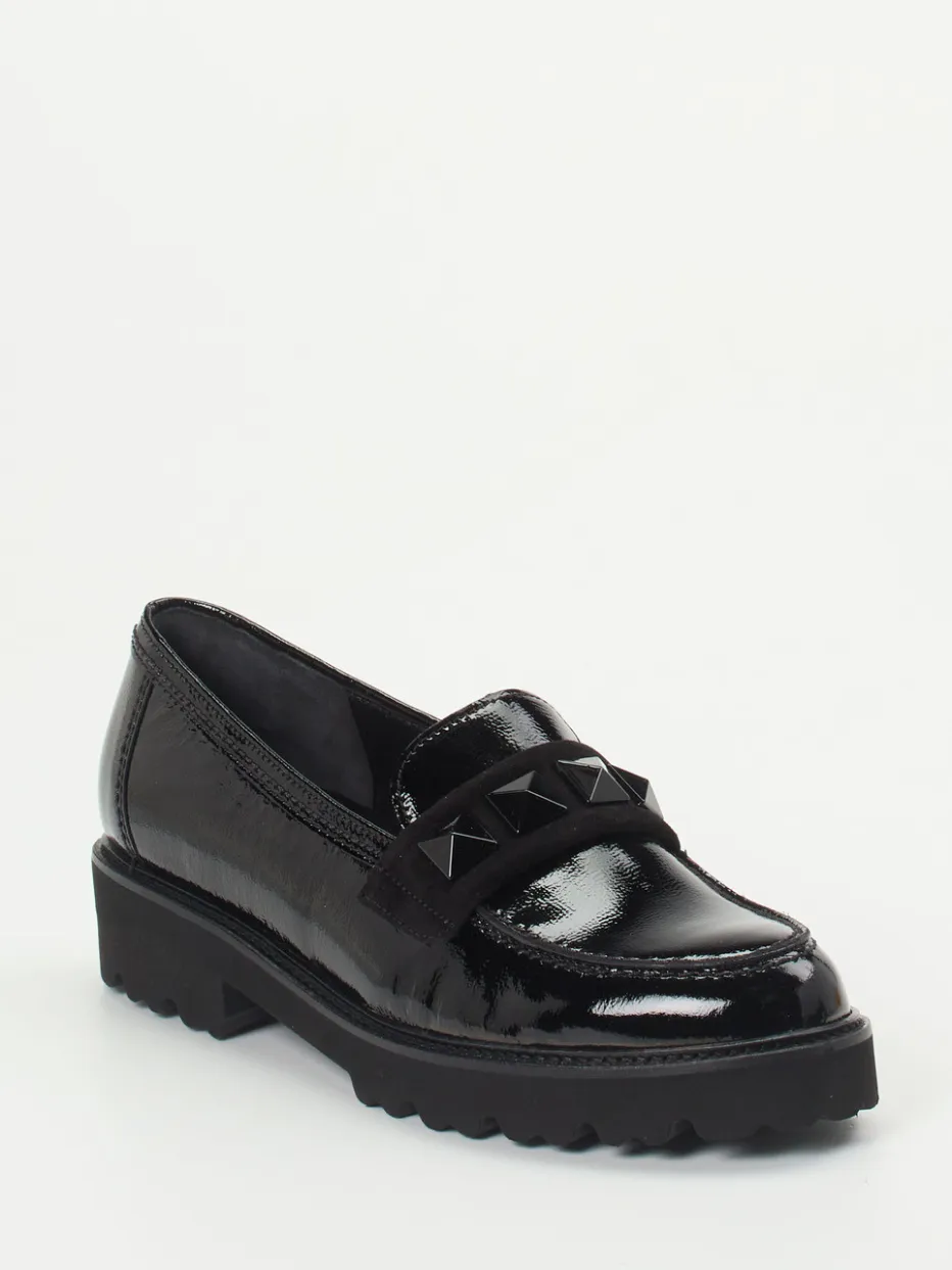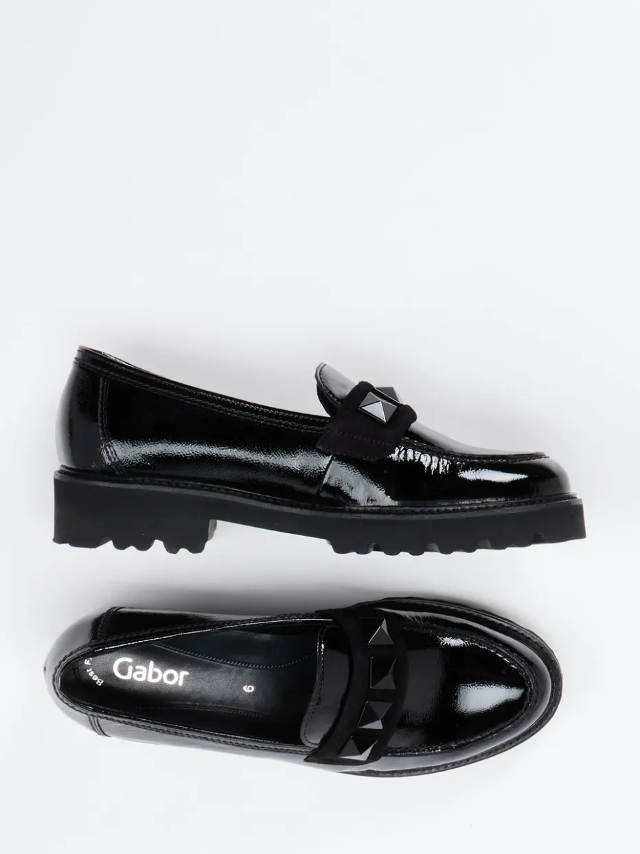 Puristische Eleganz mit Design-Kante.Gabor präsentiert einen stilvollen Damen-Loafer aus glänzend schwarzem Lackleder. Ob im Office oder beim Stadtbummel – der klassische Schnitt mit gerundeter Form trifft auf markante Akzente wie die pyramidalen Nieten auf einem samtigen Riegel aus Veloursleder. Die robuste Gummisohle mit Profil und der leichte Blockabsatz sorgen für guten Halt und einen modischen Auftritt. Ein gepolstertes Lederfußbett sowie das Futter aus Kalbleder erhöhen den Tragekomfort. Der Look spielt mit minimalistischen und streetwear-inspirierten Elementen und liegt damit im Trend. Stilbewusstes Design mit Komfort – typisch Gabor.