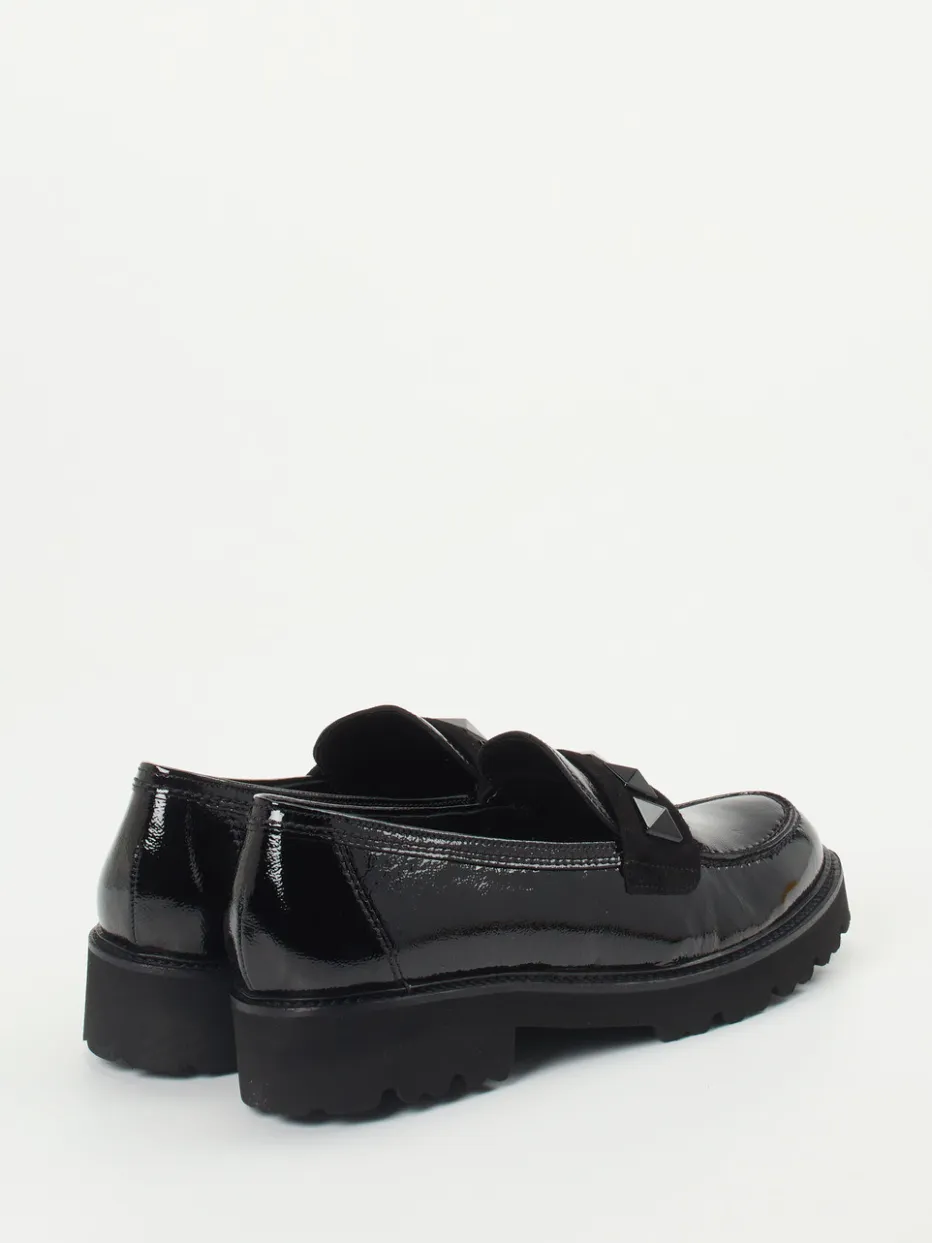 Dieser puristisch designte Damen-Loafer kombiniert edles Lackleder mit angesagten Nieten-Details – ideal für moderne Alltags- und Business-Looks.