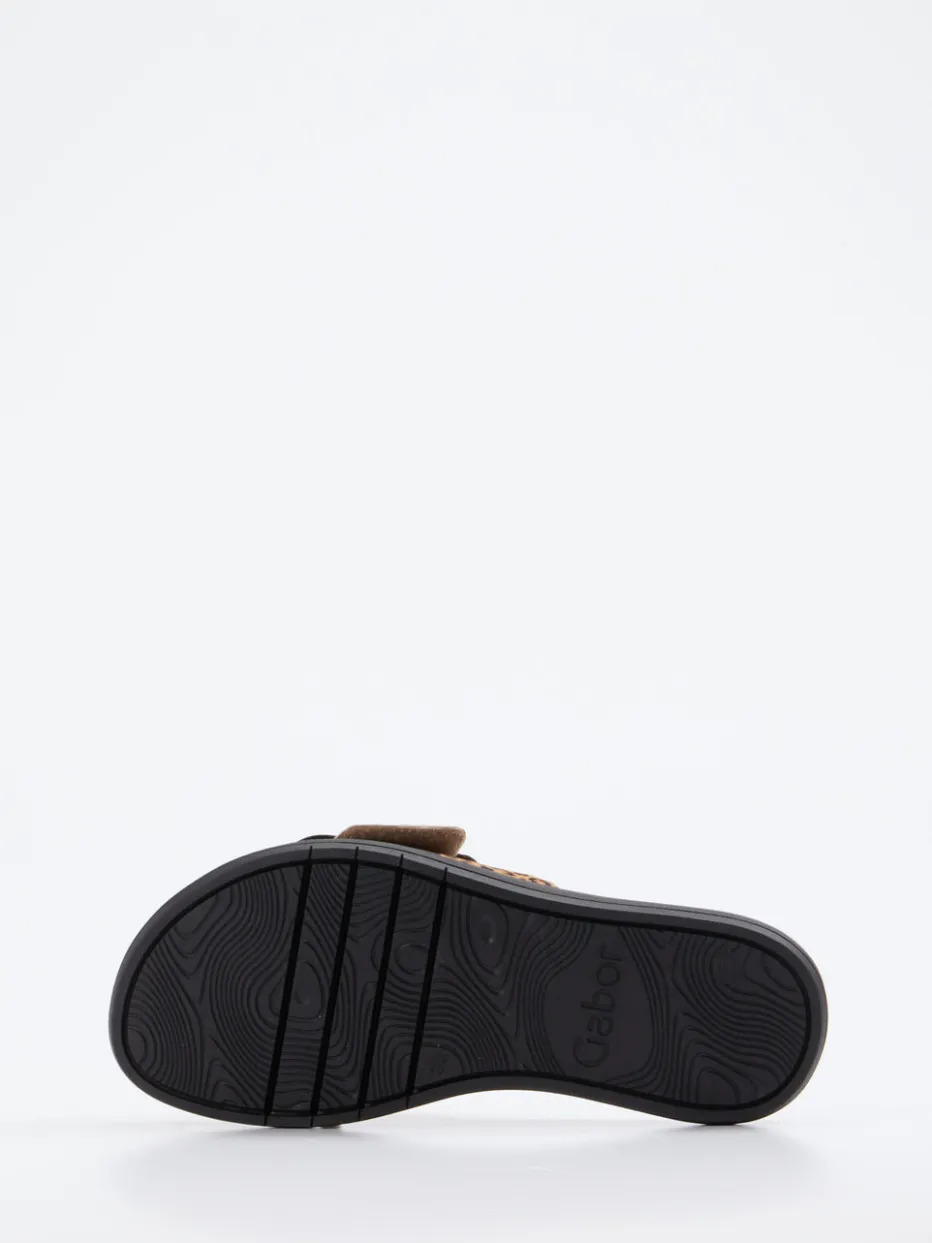 Ein Eyecatcher für entspannte Sommertage.Gabor präsentiert mit dieser Damenpantolette eine stylische Ergänzung für urbane Freizeitlooks. Ideal für Urlaub oder Alltag punktet die offene Slide-Silhouette mit einer auffälligen Leopardenoptik auf geprägtem Leder. Eine große schwarze Zierschnalle mit integriertem Klettverschluss setzt ein Statement und erlaubt die individuelle Weiteneinstellung. Das gepolsterte, ergonomisch geformte Lederfußbett bietet komfortable Unterstützung, während die rutschhemmende Gummisohle Sicherheit im sommerlichen Stadttrubel garantiert. Perfekt zu Leinenkleid, Shorts oder monochromen Outfits kombinierbar. Design und Tragekomfort verbinden sich bei Gabor zu stilvollem Casual Chic mit Substanz.