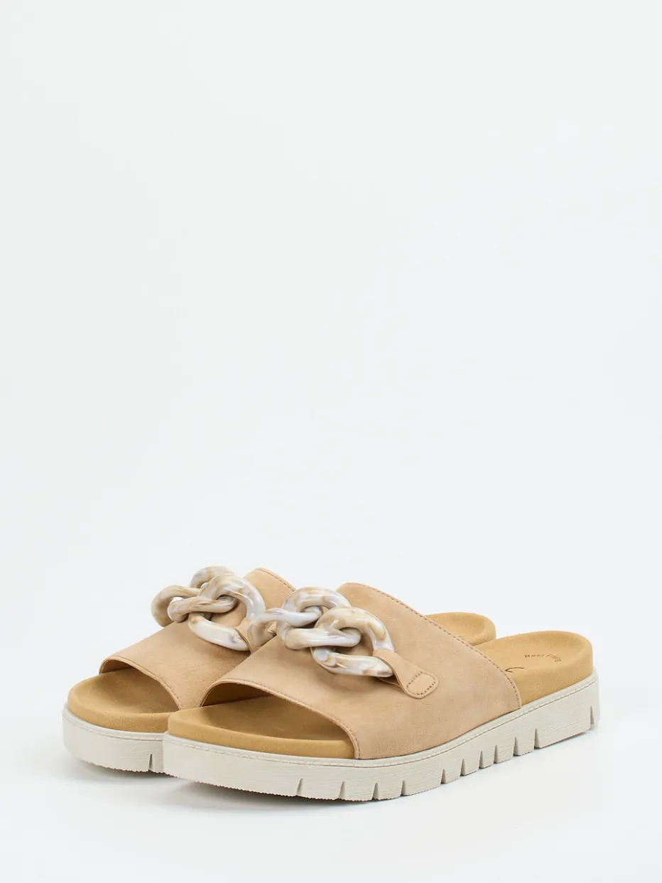 Diese Pantoletten vereinen soft getöntes Veloursleder mit einem markanten Kettendetail und bieten durch ihr ergonomisches Fußbett sowie die profilierte Sohle optimalen Alltagskomfort.