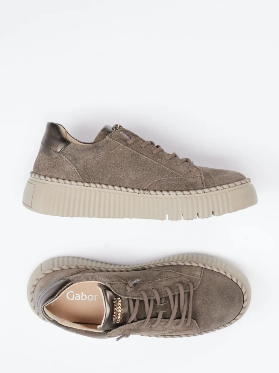 Modernes Design trifft urbanen Komfort.Gabor präsentiert mit diesem Damen-Sneaker eine trendbewusste Variante für stilvolle Freizeitlooks. Ob beim Stadtbummel oder im Büroalltag – der aus braunem Veloursleder gefertigte Plateau-Sneaker überzeugt mit weich-matter Oberfläche, dekorativen Schmucksteinen auf der Lasche und einer metallic-schimmernden Fersenkappe. Die rund-kompakte Silhouette und die profilierte Gummisohle mit 4 cm Absatzhöhe stehen für angesagten Chunky-Style und zuverlässigen Halt. Die komfortable Ausstattung mit Memory-Foam-Fußbett sowie Eignung für Einlagen unterstreicht die Alltagsqualität. Besonders harmonisch kombinierbar mit Naturtönen und minimalistischen Outfits. Premium-Komfort von Gabor mit moderner Streetwear-Ästhetik.