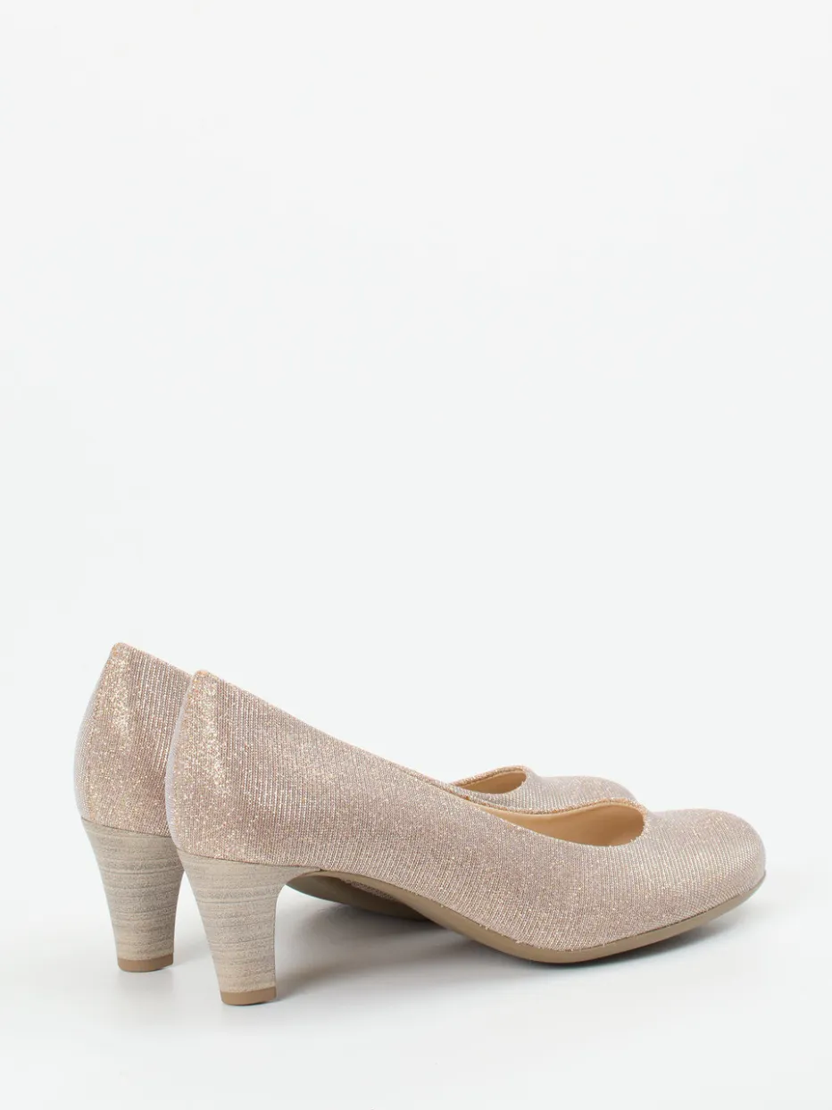 Für besondere Momente gemacht: Das Modell vereint schimmerndes Metallicleder mit dezentem Glitzereffekt in edlem Champagner. Die rund geschwungene Silhouette und der stabile 5,5 cm hohe Absatz geben eleganten Halt – perfekt für Abendveranstaltungen und festliche Anlässe. Die Schlupfform bietet bequemen Einstieg, während das gepolsterte Fußbett und das Lederinnenfutter den Tragekomfort steigern. Inspiriert vom Vintage-Minimalismus und aktuell im Trend „Metallic Accents AW24“, wirkt der Schuh klassisch und modebewusst zugleich. Kombiniert mit Metallic-Clutch und Nude-Strumpfhosen entsteht ein stilvoller Auftritt.