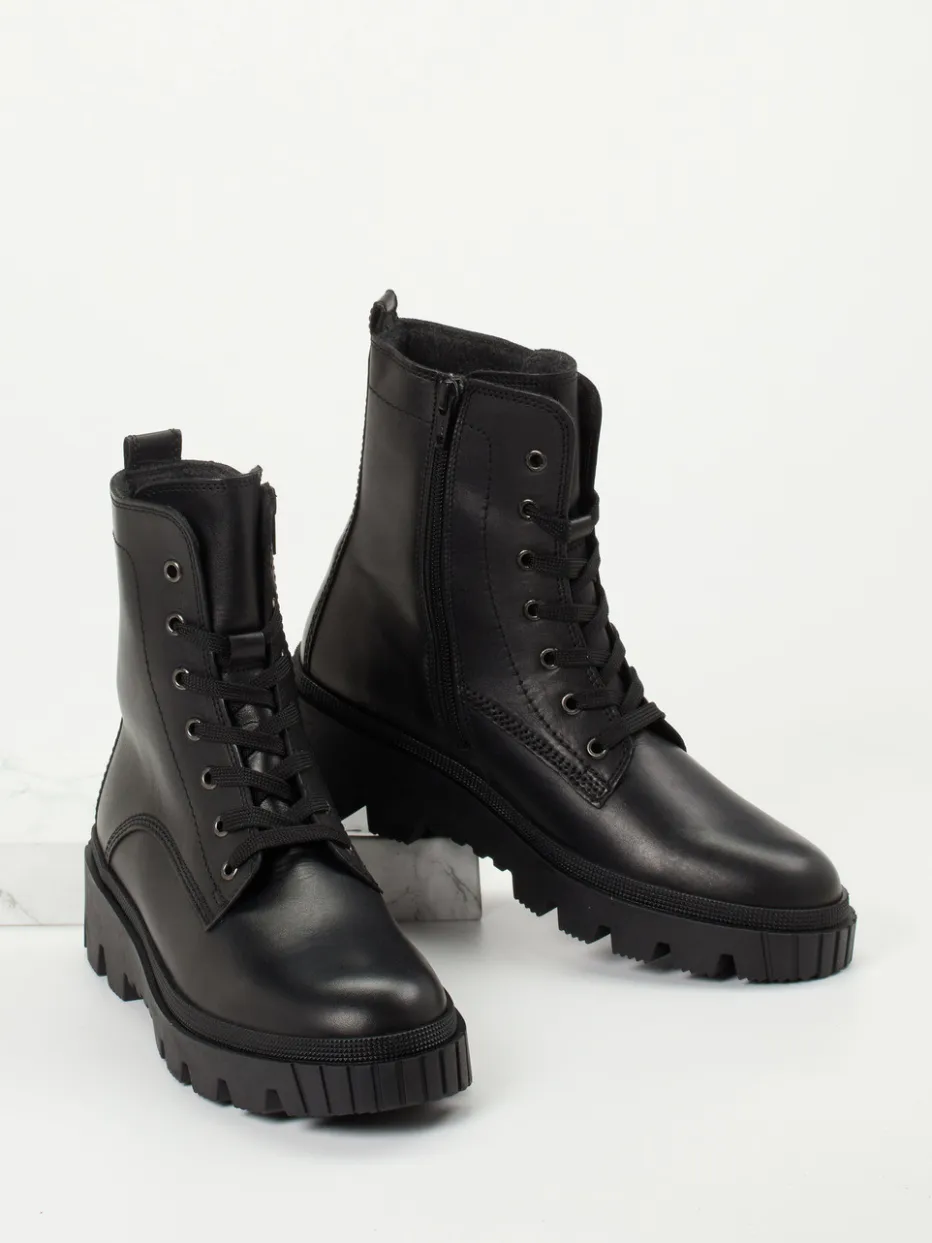 Stilvoll durch Herbst und Winter. Gabor präsentiert mit dieser Damen-Schnürstiefelette ein smartes Modell für den Alltag. Für urbanes Wetter und wechselhafte Bedingungen bietet die Kombination aus mattem Kalbleder und weichem Fleecefutter angenehmen Schutz. Die schwarze Farbgebung ist klassisch-modern, während tonale Nähte und schwarze Metallösen dem Boot Struktur und Charakter verleihen. Eine robuste Gummisohle mit tiefem Profil sorgt dabei für Rutschfestigkeit im Outdoor-Umfeld. Der seitliche Reißverschluss erleichtert das Anziehen und unterstreicht die cleane Linienführung. Ein dezenter Utility-Touch macht den Look modisch anschlussfähig. Komfort und Funktion vereinen sich hier mit reduzierter Streetwear-Ästhetik – typisch Gabor.