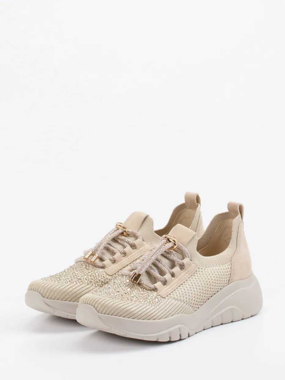 Ob für einen Spaziergang durch die Stadt oder einen stilvollen Homewear-Moment – das elastische Textilstrickmaterial passt sich dem Fuß optimal an. Kombiniert mit samtigem Veloursleder in Hellbeige, verleihen glitzernde Schmuckdetails und goldene Endkappen dem Sneaker eine dezente Eleganz. Die sportlich abgerundete Silhouette mit Schnellschnürung und flexibler Gummisohle bietet alltagstauglichen Komfort. Der Look harmoniert ideal mit Soft-Neutral-Trends der Saison und passt perfekt zu monochromen Outfits.