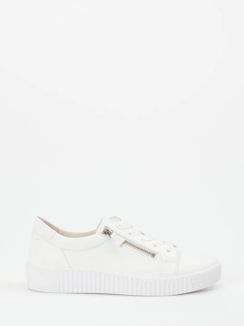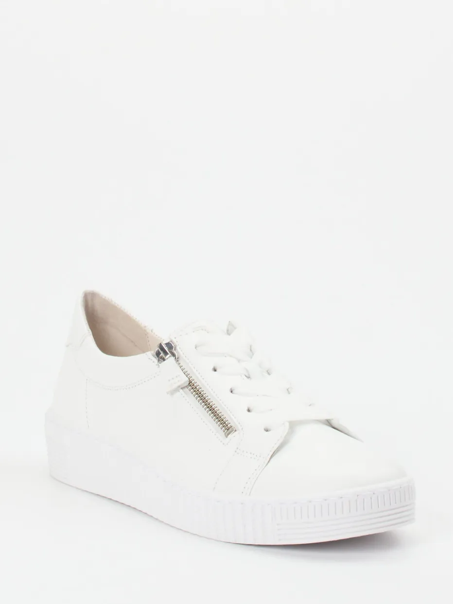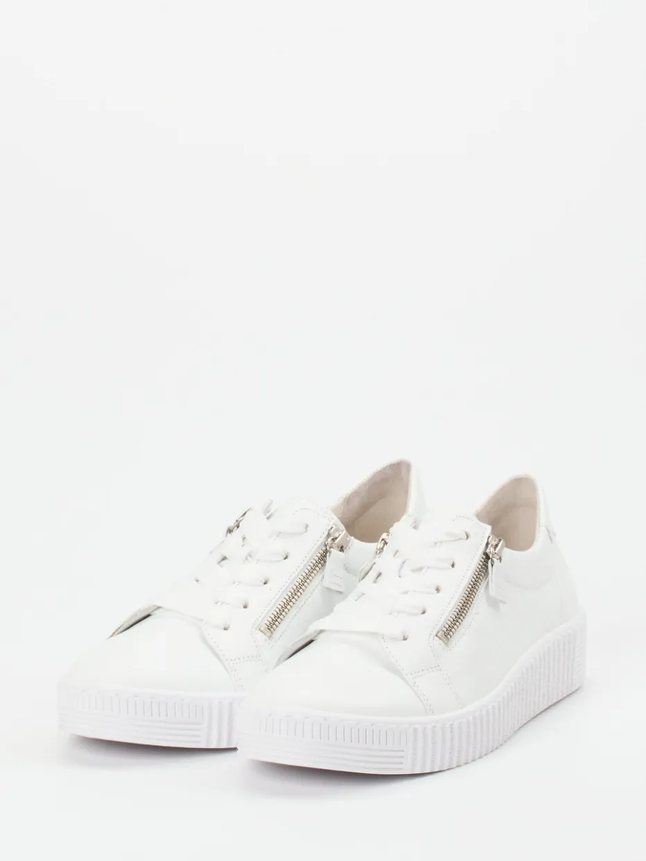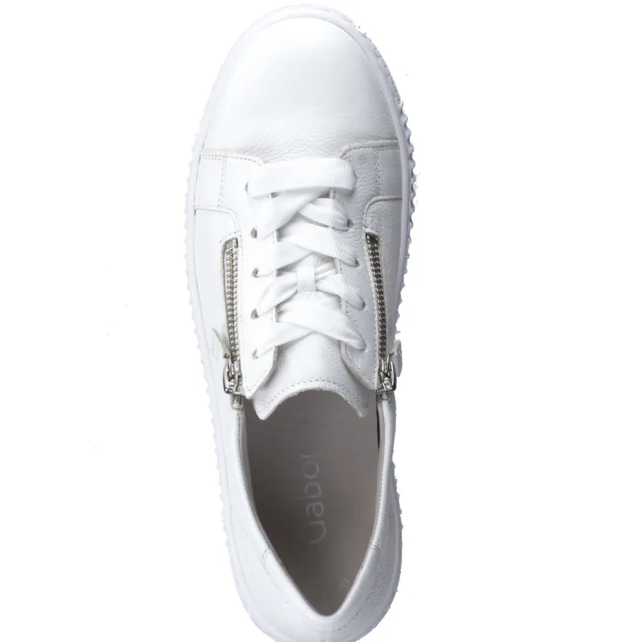 In sportlichem Design überzeugt dieser Sneaker der Marke Gabor durch seine komfortable Beschaffenheit. Das samtweiche, strukturierte Elchleder in Weiß wird durch tonige Steppnähte strukturiert. Sind die breiten Schnürbänder einmal justiert, erweisen sich die seitlichen, silberfarbenen Reißverschlüsse als angenehm. Von innen mit softem Leder gefüttert und mit einem Wechselfußbett ausgestattet ist Komfort garantiert. Die Sportlichkeit unterstreicht die tonige, strukturierte Gummisohle.