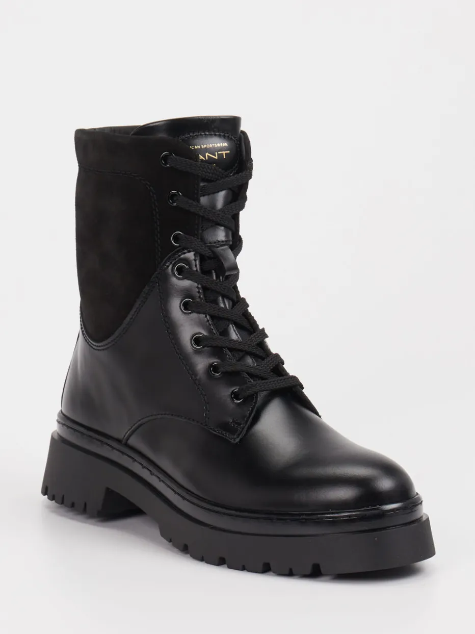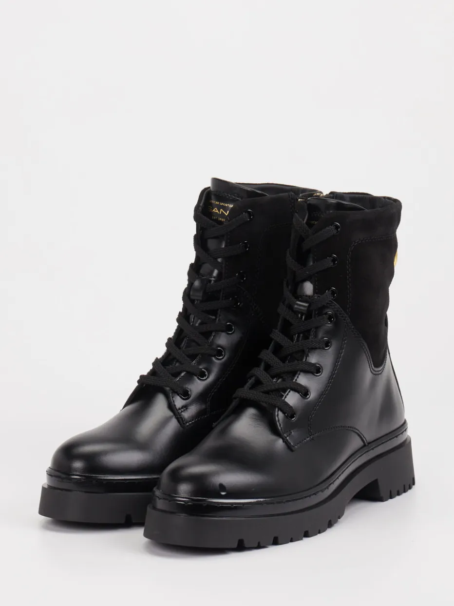 Stil trifft Funktion im urbanen Alltag. Die Marke Gant präsentiert mit diesen Schnürboots eine moderne Interpretation robuster Damen-Stiefeletten. Aus einem feinen Mix aus Glatt- und Veloursleder gefertigt, punkten die knöchelhohen Boots in tiefem Schwarz mit tonalen Nähten und goldfarbenen Reißverschlüssen und Ösen. Die profilierte Gummisohle sorgt für zuverlässigen Halt, während eine Kombination aus Schnürung und seitlichem Reißverschluss den Einstieg erleichtert. Optisch betont der Utility-Stil die klare Silhouette – ideal zu Denim, Cargohosen oder Strickkleid. Die ruhige Farbgebung spiegelt den Trend zu „Quiet Luxury“ wider. Ein vielseitiger Begleiter mit Gant-typischem Understatement und Komfortanspruch.