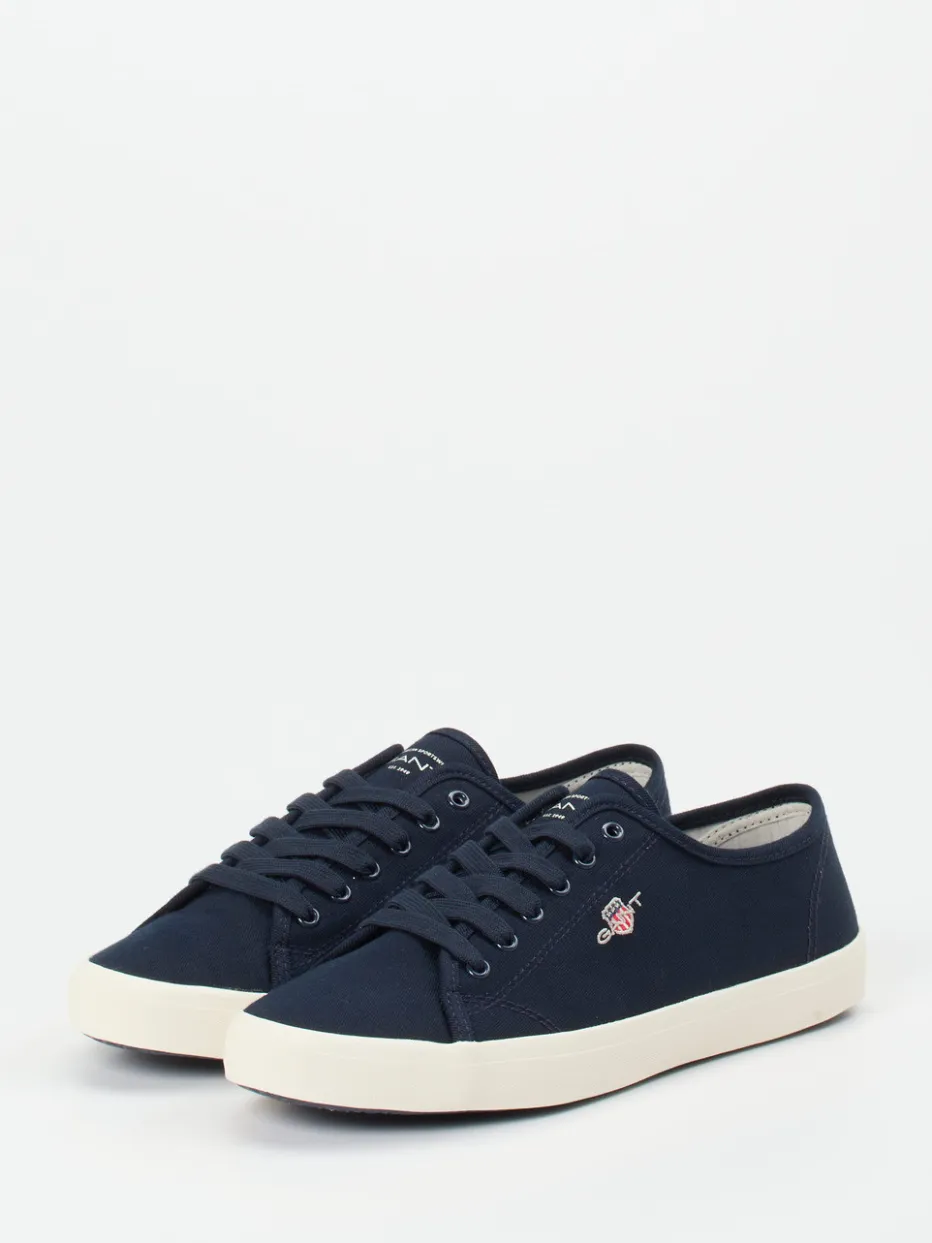 Sommerfrische im Retro-Look.Die amerikanische Marke Gant präsentiert mit diesem Sneaker ein zeitloses Modell für Damen im Low-Top-Stil. Ob auf Städtetrips oder beim entspannten Bummel durchs Viertel – der dunkelblaue Canvas mit matter Oberfläche verleiht dem Schuh seinen preppy Charakter. Die tonale Schnürung und das fein gestickte Markenlogo unterstreichen das reduzierte Design. Die vulkanisierte, cremefarbene Gummisohle wirkt subtil kontrastierend und sorgt für rutschhemmenden Halt. Kombiniert mit Chinohose und T-Shirt entsteht ein cleaner Sommer-Look. Ein vielseitiger Klassiker mit dem authentisch-sportiven Stil von Gant.