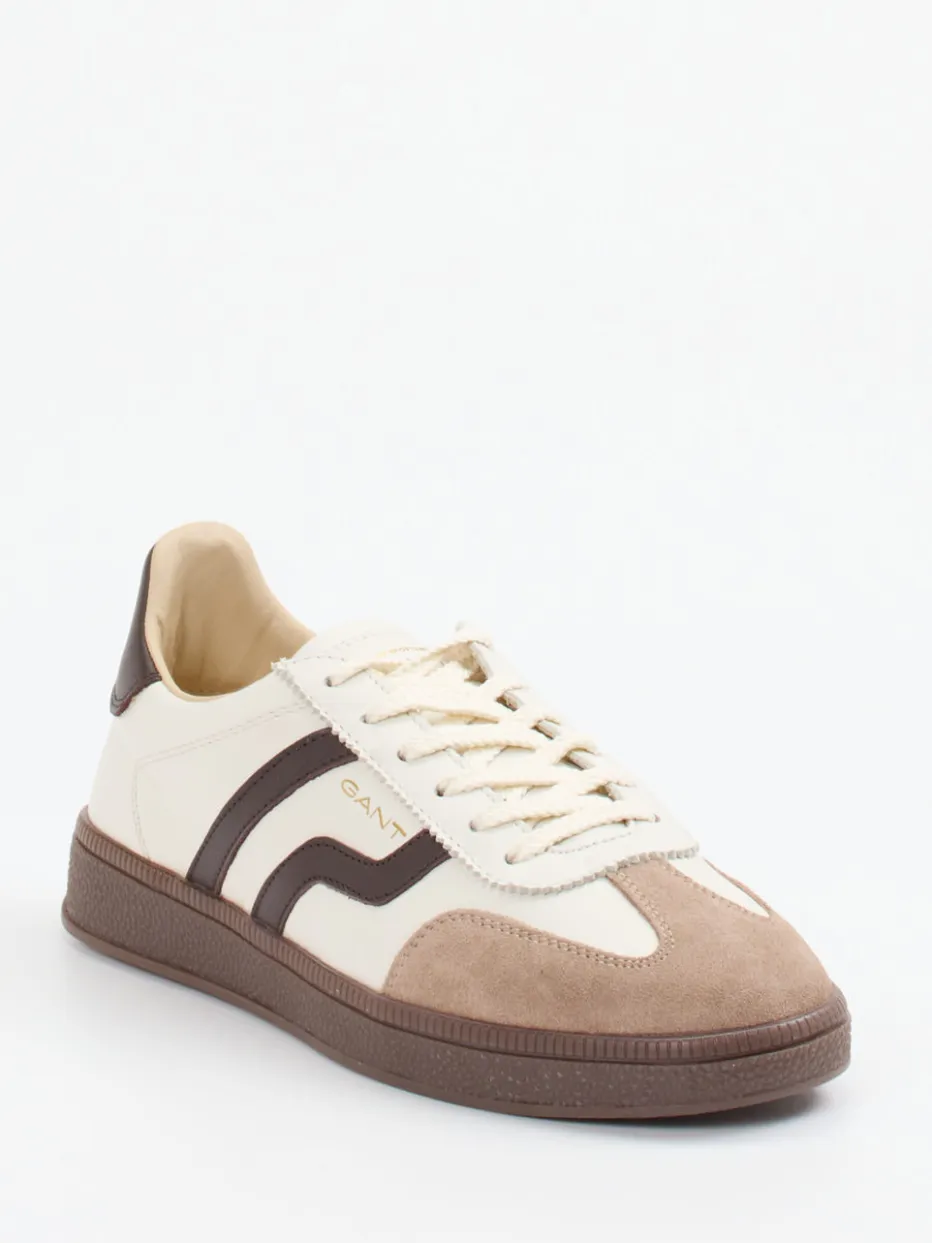 Stilvoller Retro-Charme für den Alltag.Gant präsentiert diesen Low-Top Herren-Sneaker als stilvollen Begleiter für Freizeit und Business Casual. Die Kombination aus glattem Kalbleder und samtigem Veloursleder sorgt für einen hochwertigen Materialmix mit angenehmem Tragegefühl. Die cremeweiße Basis wird durch schokobraune und taupefarbene Zierpartien sowie goldfarbene Logodetails kontrastreich akzentuiert. Klassische Schnürung, seitliche Zierstreifen und eine flexible, profilierte Gummisohle runden das durchdachte Design ab. Die flache Silhouette trifft auf stilbewusste Retro-Sportswear – ideal für Outfits im Quiet-Luxury-Trend. Gut kombinierbar mit Naturtönen und Lederaccessoires. Ein moderner Klassiker mit Understatement und Komfortanspruch von Gant.