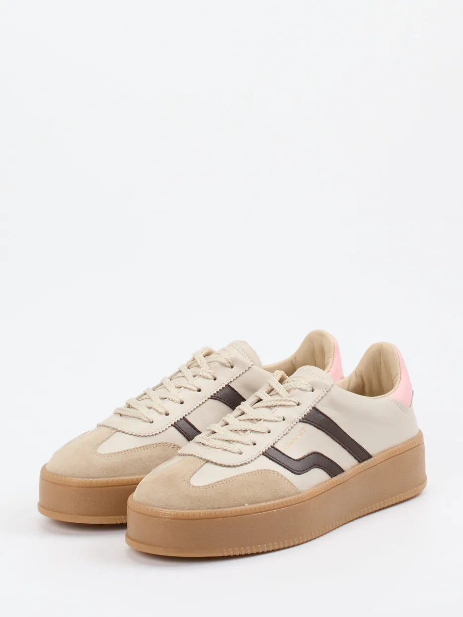 Retro-Neuinterpretation mit modernem Akzent.Der Damen-Sneaker von Gant vereint sportives Design mit modischen Details. Für komfortbetonte Tage im urbanen Umfeld kombiniert das Modell beigefarbenes Kalbveloursleder mit glatten Ledereinsätzen sowie einem roséfarbenen Fersenakzent. Die honigfarbene Plateaugummisohle interpretiert die Retro-Ästhetik der 80er neu und sorgt zugleich für sicheren Auftritt und hohen Tragekomfort. Ein seitliches Logo in Gold sowie kontrastierende Streifen unterstreichen den hochwertigen Look mit minimalistischer Note. Dank klassisch-runder Form und grob geflochtener Schnürung fügt sich der Schuh ideal in entspannte Freizeitoutfits. Ein trendbewusster Alltagsbegleiter mit komfortablem GANT-Charakter.