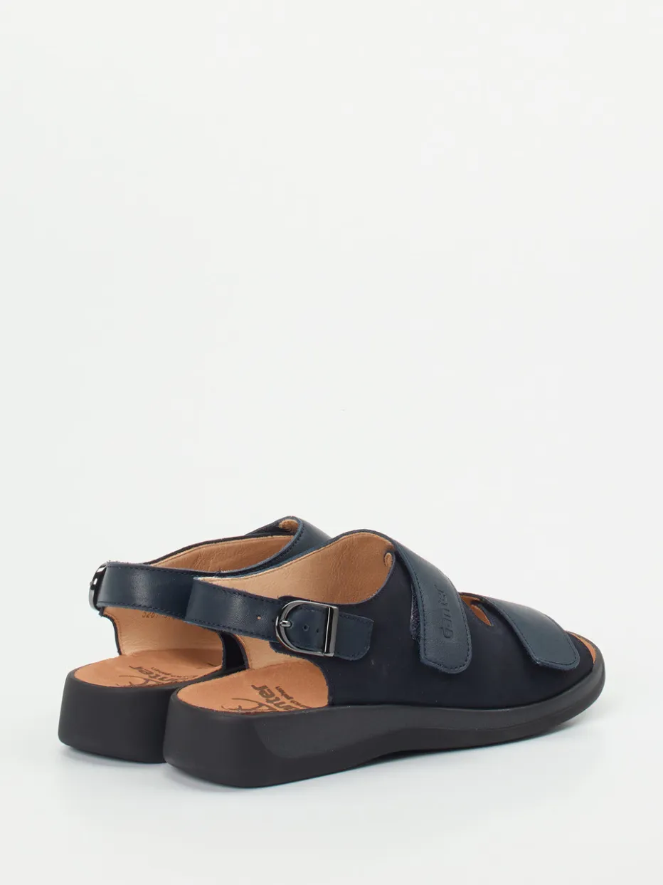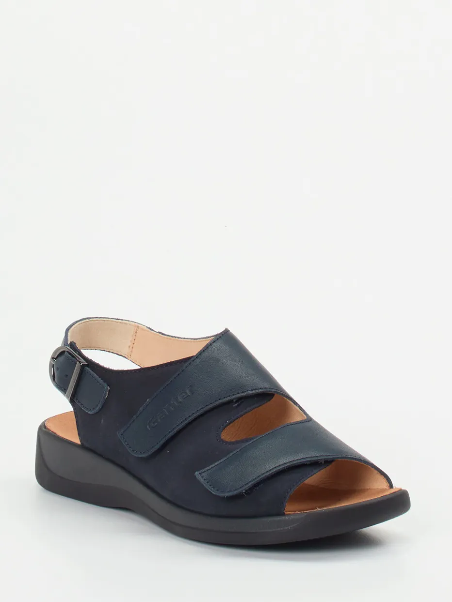 Komfort beginnt bei jedem Schritt.Die Marke Ganter präsentiert mit dieser Komfort-Sandale ein Modell, das auf ergonomisches Design und hochwertige Materialien setzt. Ob beim ausgedehnten Stadtbummel oder im Alltag zu Hause – das dunkelblaue Kalbleder in Kombination mit samtigem Velours schafft einen edlen, zeitlosen Look. Das weich gepolsterte, lederbezogene Fußbett sowie das pflanzlich gegerbte Innenfutter sorgen für spürbare Entlastung. Zwei praktische Klettverschlüsse und ein verstellbarer Fersenriemen mit anthrazitfarbener Schließe bieten sicheren Halt. Die leicht glänzende PU-Sohle ist rutschhemmend und stoßdämpfend – optimal für alle, die Komfort priorisieren. Besonders gut kombinierbar mit Leinenoutfits oder luftig geschnittenen Hosen. Typisch Ganter: Formvollendeter Gehkomfort mit orthopädischem Anspruch.