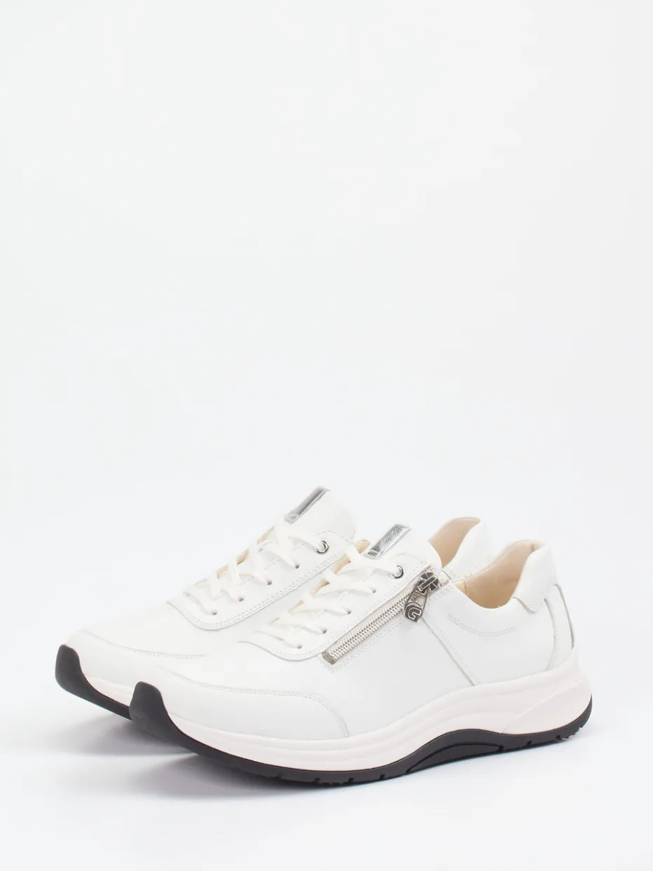 Für längere Wege in der Stadt oder entspannte Freizeitstunden bietet dieser Sneaker aus butterweichem Kalbleder mit matter Oberfläche wohltuenden Tragekomfort. Das dominierende Off-White harmoniert mit dezenten, silbernen Reißverschlussdetails und Ton-in-Ton-Nähten. Klassisch-sportlich in der Silhouette, erleichtert die Kombination aus Schnürung und seitlichem Zipper das An- und Ausziehen. Die dämpfende Gummisohle mit 4-Punkt-Technologie fördert einen natürlichen Abrollvorgang. Perfekt für „Quiet Luxury“-Looks mit Stretch-Jeans und Lederaccessoires.