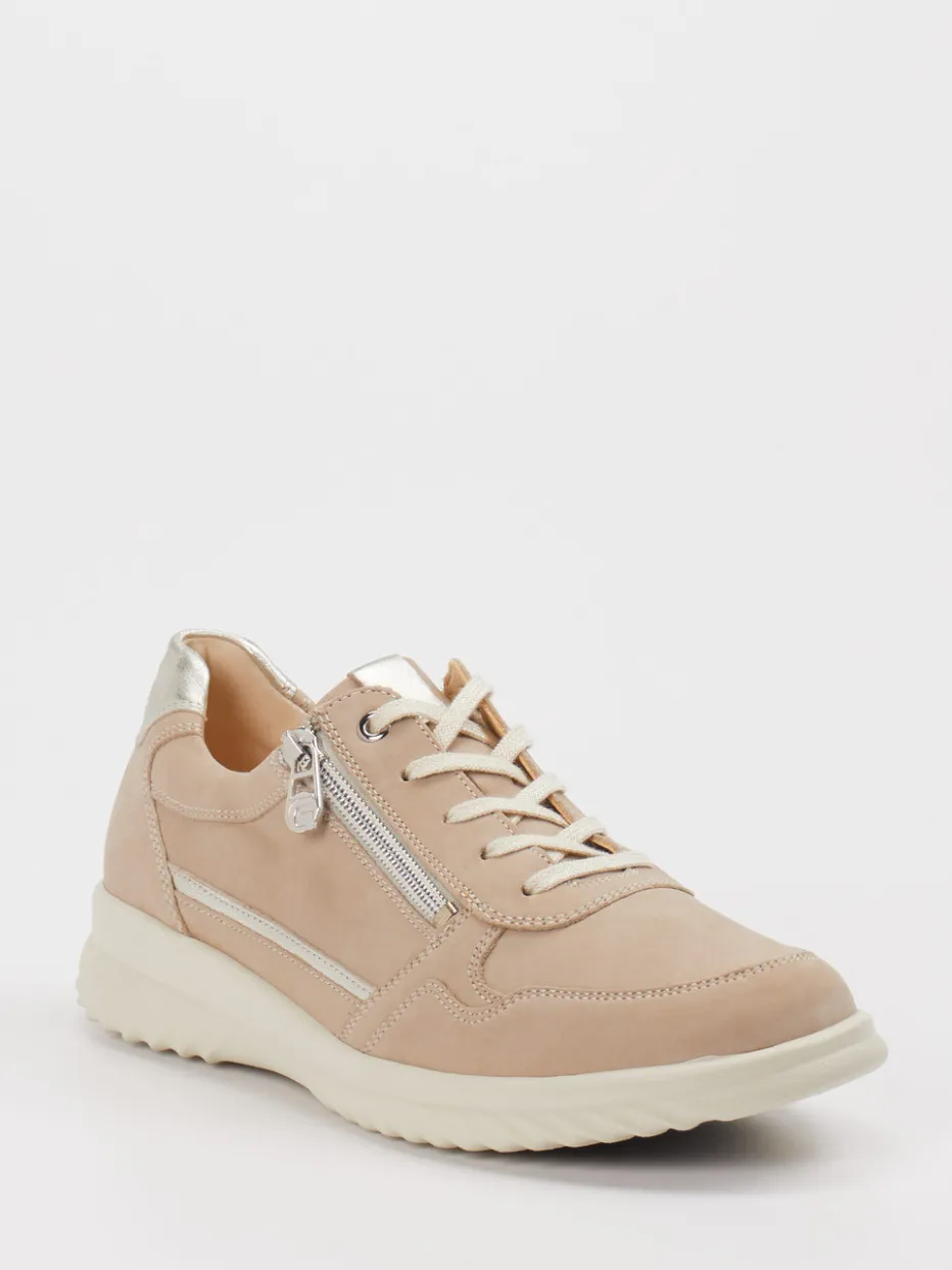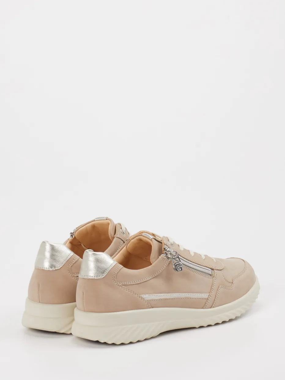 Vielseitig durch Alltag und Freizeit. Ganter präsentiert mit diesem Damen-Komfort-Sneaker ein Modell für entspanntes Gehen und subtilen Stil. Bei langen Tagen auf den Beinen bietet die weich gepolsterte PU-Sohle mit Profil wohltuende Unterstützung. Das beige Nubukleder verleiht dem Schuh eine matte, edle Ausstrahlung, ergänzt durch silberfarbene Metallic-Details an Ferse und Lasche. Die klassische Silhouette mit seitlichem Reißverschluss und Schnürung verbindet sicheren Halt mit leichtem Einstieg. Der dezente Look im Trendfeld „Quiet Luxury“ passt ideal zu Ton-in-Ton-Outfits oder zurückhaltend sportiven Styles. Ein komfortorientierter Sneaker, der Ganter-typische Qualität mit zeitloser Alltagstauglichkeit verbindet.