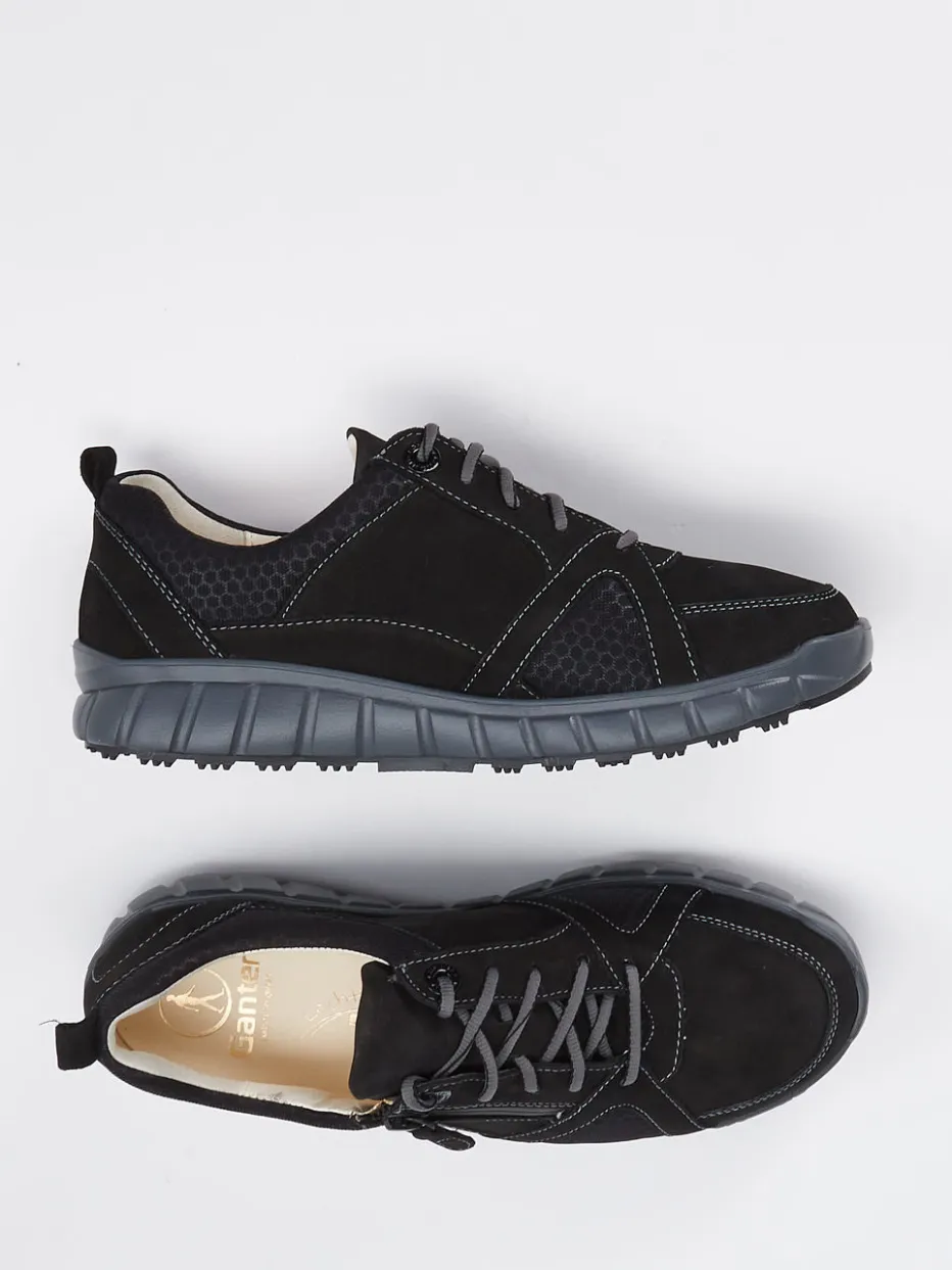 Vielseitig unterwegs mit Leichtlauf-Komfort.Ganter präsentiert einen schwarzen Komfort-Sneaker mit durchdachtem Design für Alltag und Freizeit. Der Schnürschuh kombiniert hochwertiges Veloursleder mit atmungsaktivem Mesh-Textil in matter Oberfläche. Das rund ergonomische Design überzeugt mit seitlichem Reißverschluss, hellgrauen Kontrastnähten und einer praktischen Zuglasche. Innen weich gepolstert und mit austauschbarem lederbezogenem Korkfußbett ausgestattet, sorgt er für Gehkomfort selbst auf langen Strecken. Die profilierte Gummisohle bietet Trittsicherheit auf verschiedenem Untergrund, urbane Streetwear-Anleihen treffen auf Outdoor-Tauglichkeit. Ein funktionaler Sneaker mit Ganter-Leichtlauf-Technologie für anspruchsvolle Komfortansprüche.