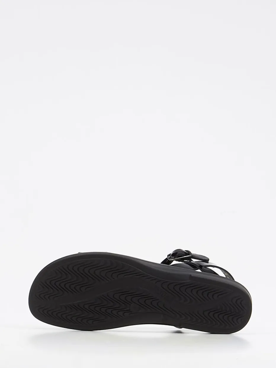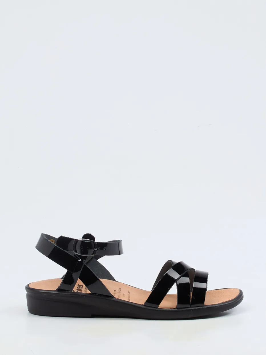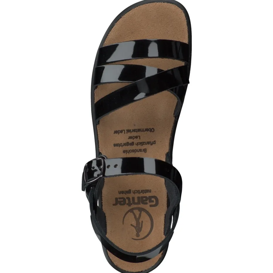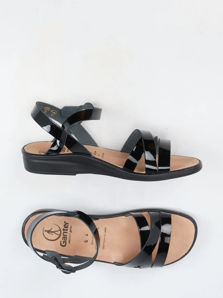 Glanz und Komfort vereint für sonnige Momente.Die Marke Ganter präsentiert mit ihrer Damensandale ein durchdachtes Komfortmodell für Sommer und Freizeit. Ideal für urbane Spaziergänge und den Urlaubseinsatz: Diese offen designte Komfortsandale aus glänzendem, schwarzem Lackleder kombiniert modeaffinen Stil mit ergonomischer Funktion. Das vegetabil gegerbte Lederfutter und das soft gepolsterte Fußbett sorgen für ein angenehm belüftetes Tragegefühl. Gekreuzte Riemen, ein verstellbarer Knöchelriemen mit Zierschnalle sowie eine leichte PU-Luftpolstersohle mit leichtem Keil schaffen Stabilität und Stil. Der monochrome Look harmoniert ideal mit Leinenhosen oder schlichten Tuniken. Ganter steht für durchdachte Passform und langlebigen Komfort – stilvoll zu jeder Gelegenheit.