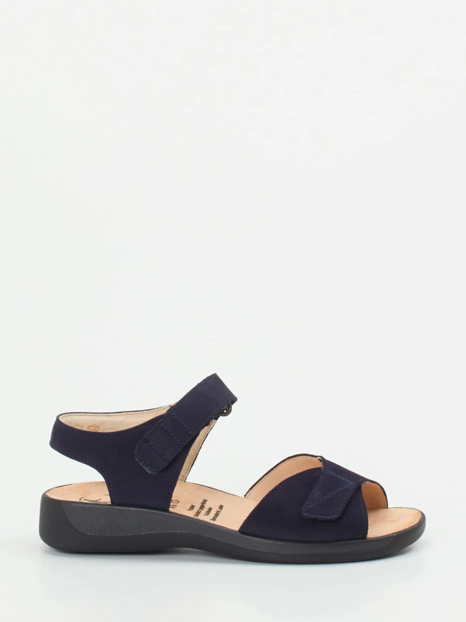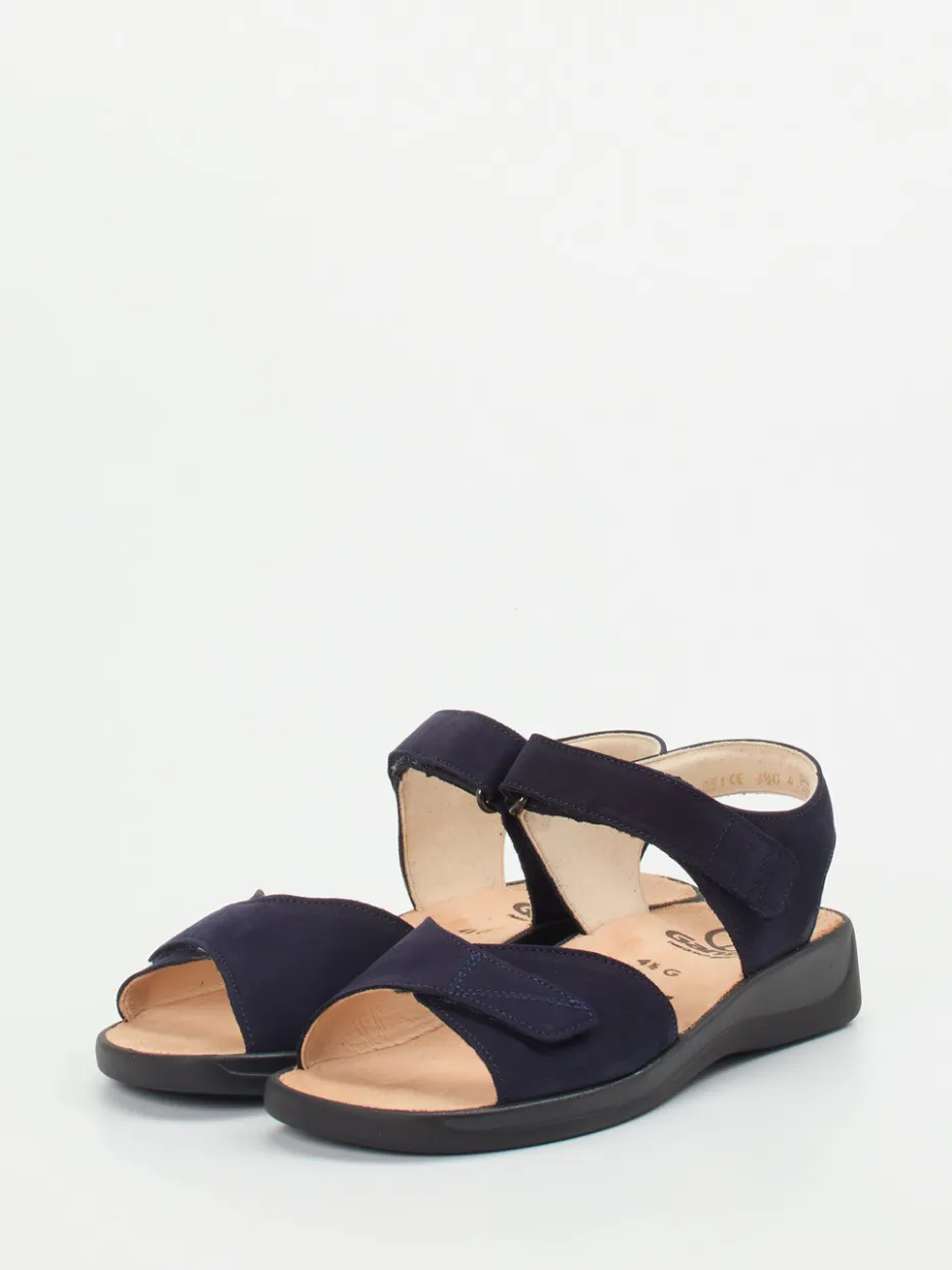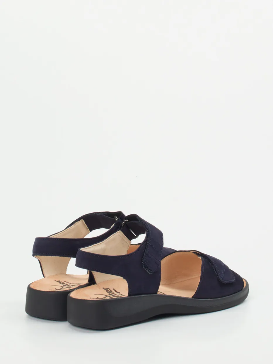 Fein angeschliffenes Nubukleder in Nachtblau trifft auf ein atmungsaktives Lederfutter mit hautfarbenem Ton – minimalistisch verarbeitet mit tonalen Ziernähten. Die beiden Klettverschlüsse bieten individuelle Weitenregulierung, das gepolsterte, mit pflanzlich gegerbtem Kalbleder bezogene Fußbett sorgt für maximalen Komfort. Eine flexible PU-Sohle mit rutschhemmendem Profil rundet die Funktionalität ab. Optimal kombinierbar zu Leinenhosen oder luftigen Alltagsoutfits.
