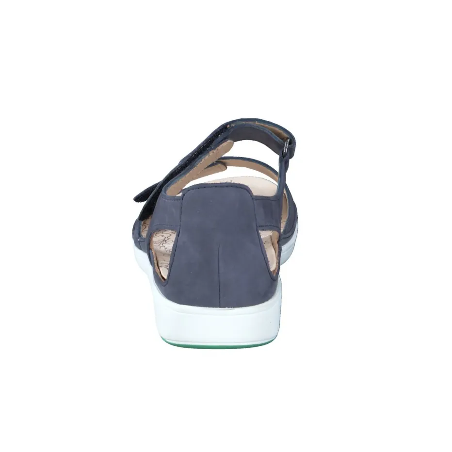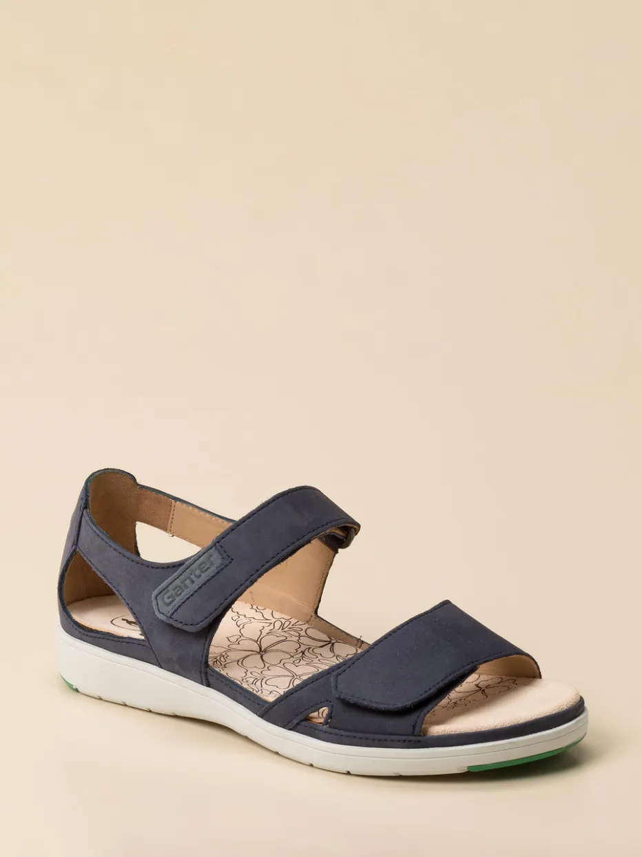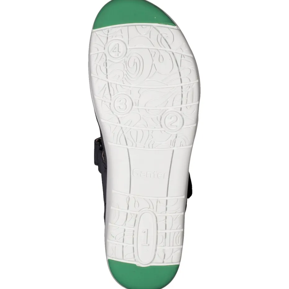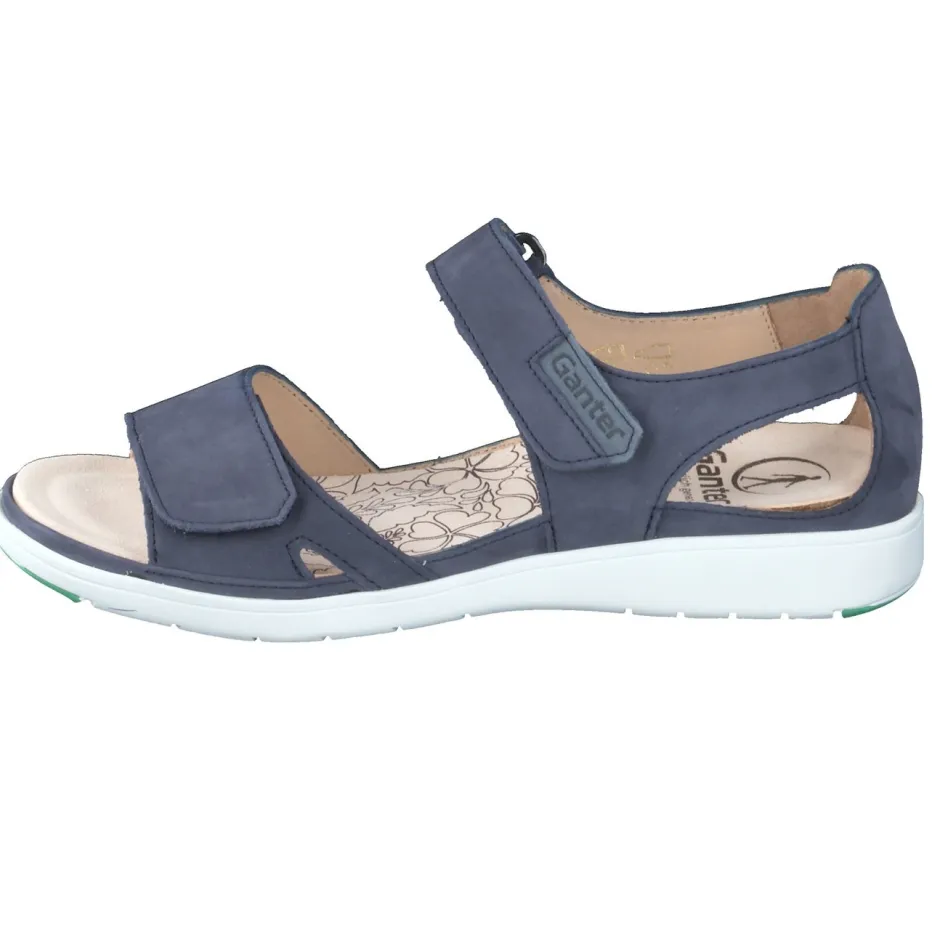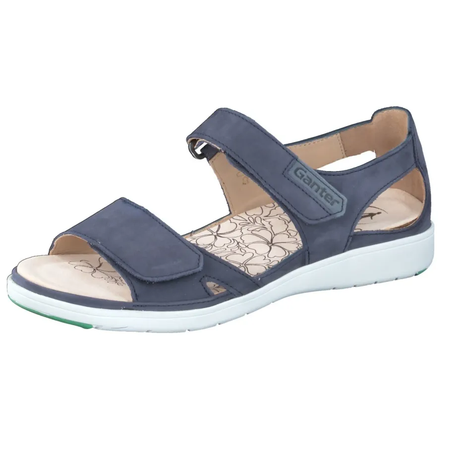 Bequemer Stil für warme Tage.Die Marke Ganter überzeugt in der Komfortkategorie mit dieser Damen-Sandale in Dunkelblau. Für ausgiebige Stadtbummel oder entspannte Momente zu Hause bietet sie mit ergonomisch geformtem Fußbett und gepolsterter Innensohle ein gehobenes Tragegefühl. Gefertigt aus samtig angeschliffenem Nubukleder, ergänzt durch ein atmungsaktives Innenfutter aus vegetabil gegerbtem Leder. Zwei Klettverschlüsse optimieren die Passform, während die weiße Gummisohle mit grünem Profil sicheren Halt gewährleistet. Designakzente wie das florale Muster im Fußbett und die Ton-in-Ton-Nähte unterstreichen den funktional-minimalistischen Look. Lässt sich ideal mit Leinenhosen oder Funktionsshirts kombinieren. Ein Modell für stilbewusste Frauen mit Wunsch nach natürlichem Komfort.