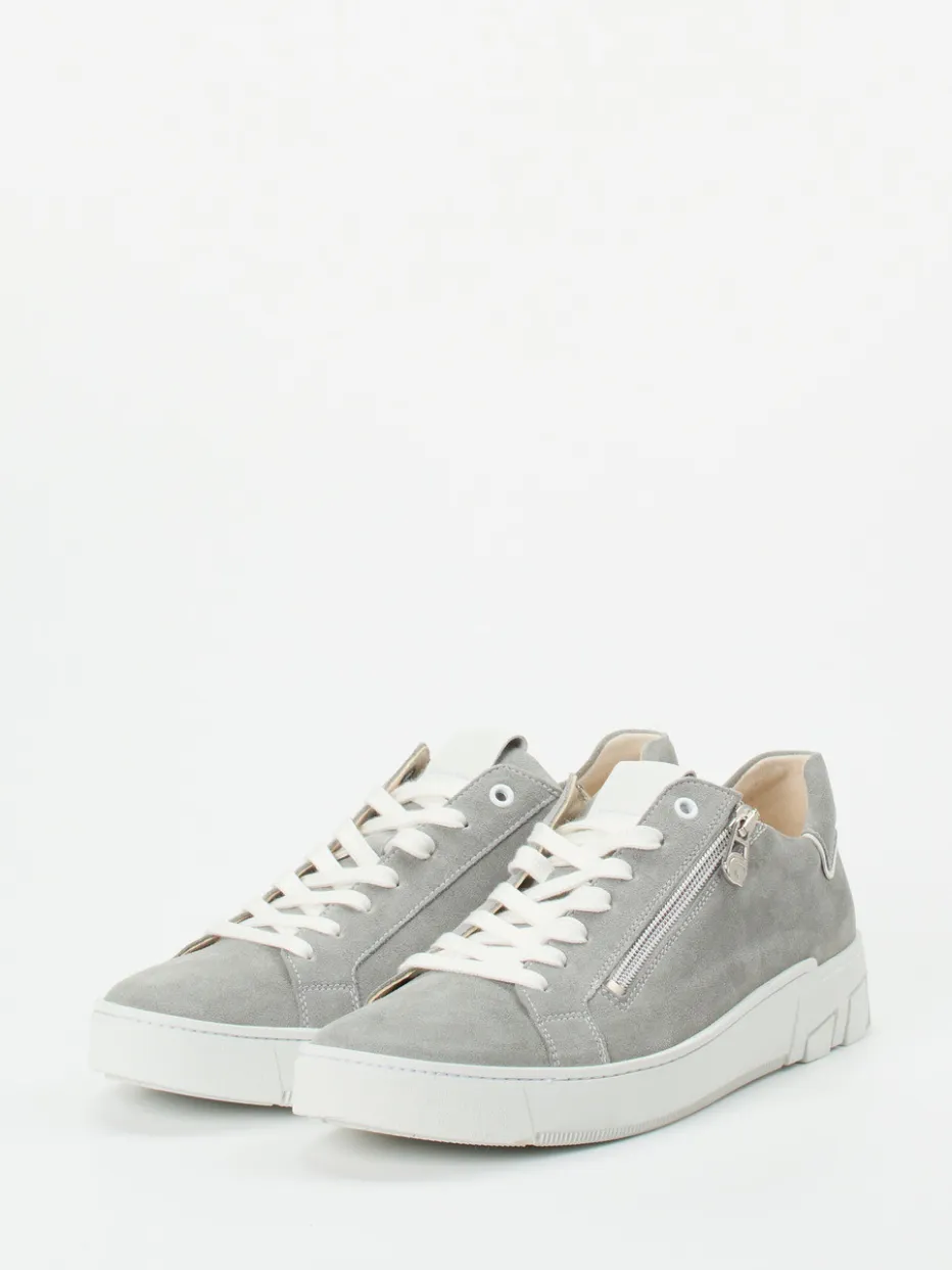 Die Kombination aus hellgrauem Veloursleder – samtig angeschliffen – und pragmatischen Details wie der gepolsterten Schaftrand-Partie, der komfortablen Weite G und einem silberfarbenen Reißverschluss ergibt einen stimmigen Look. Die verstärkte, rutschhemmende Gummisohle sorgt gemeinsam mit dem weichen Kork-Fußbett für angenehmes Gehen, auch über längere Distanzen hinweg. Der cleane Schnitt und weiße Akzente transportieren dezente Streetwear-Ästhetik im Geiste von „Quiet Luxury“. Lässt sich mit Basic-Shirts und Crossbody-Bag lässig kombinieren.