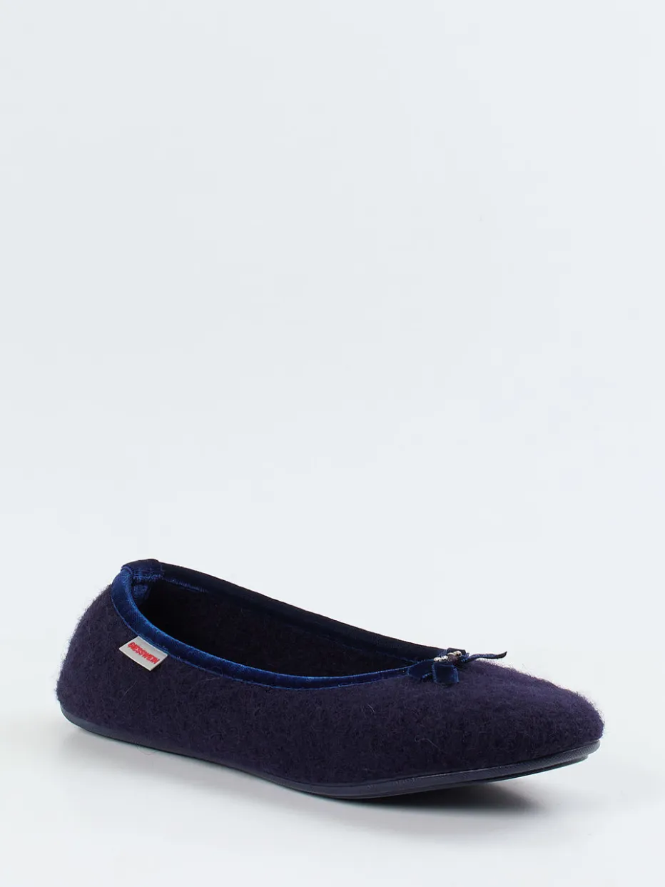 Die flachen Hausschuhe kombinieren wärmenden Wollfilz mit dekorativen Details wie Samtpaspel und Schleife – ideal für stilvollen Komfort daheim.