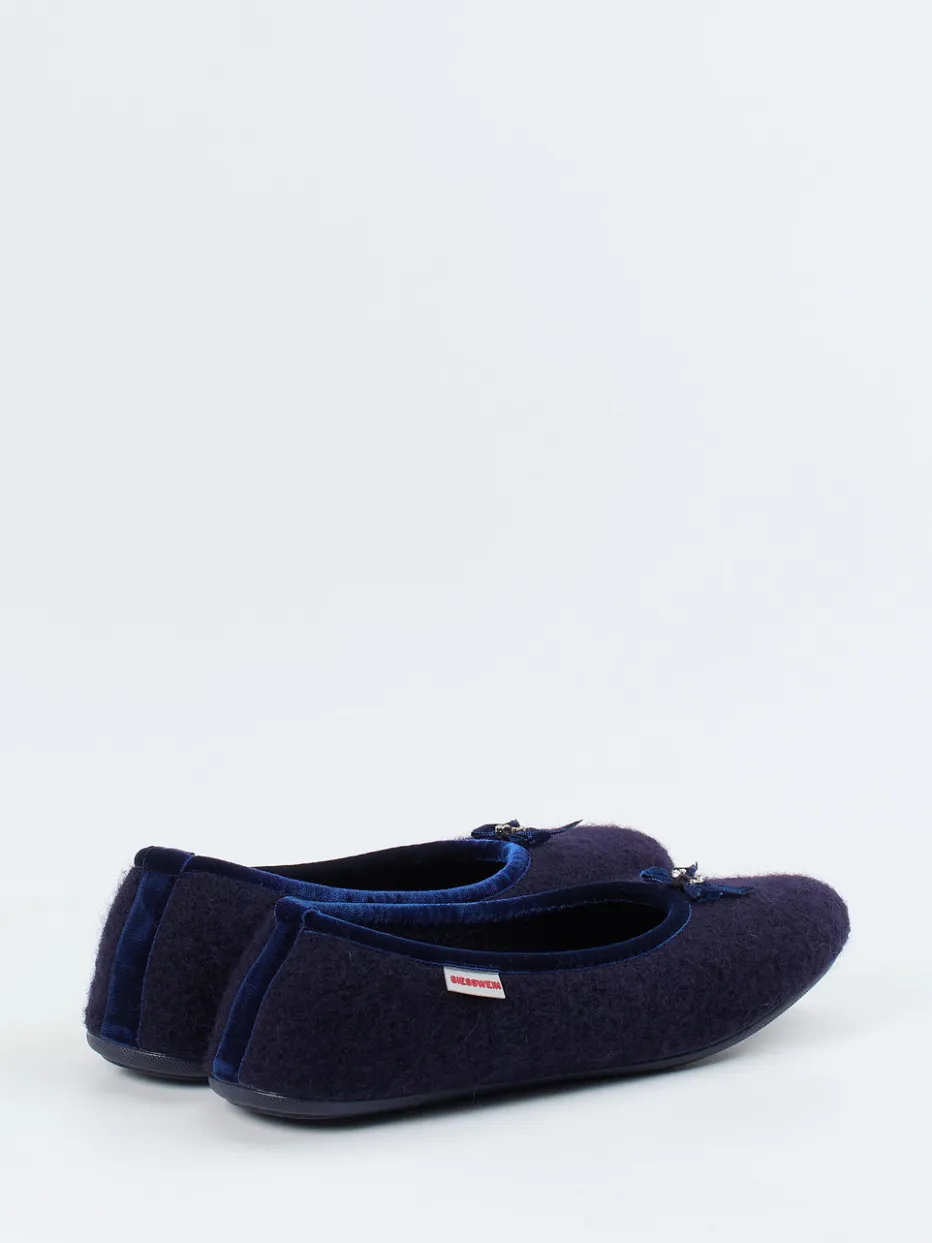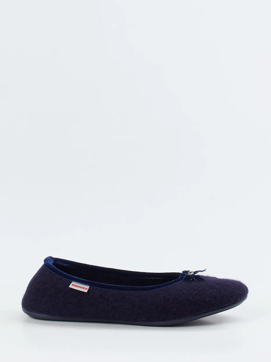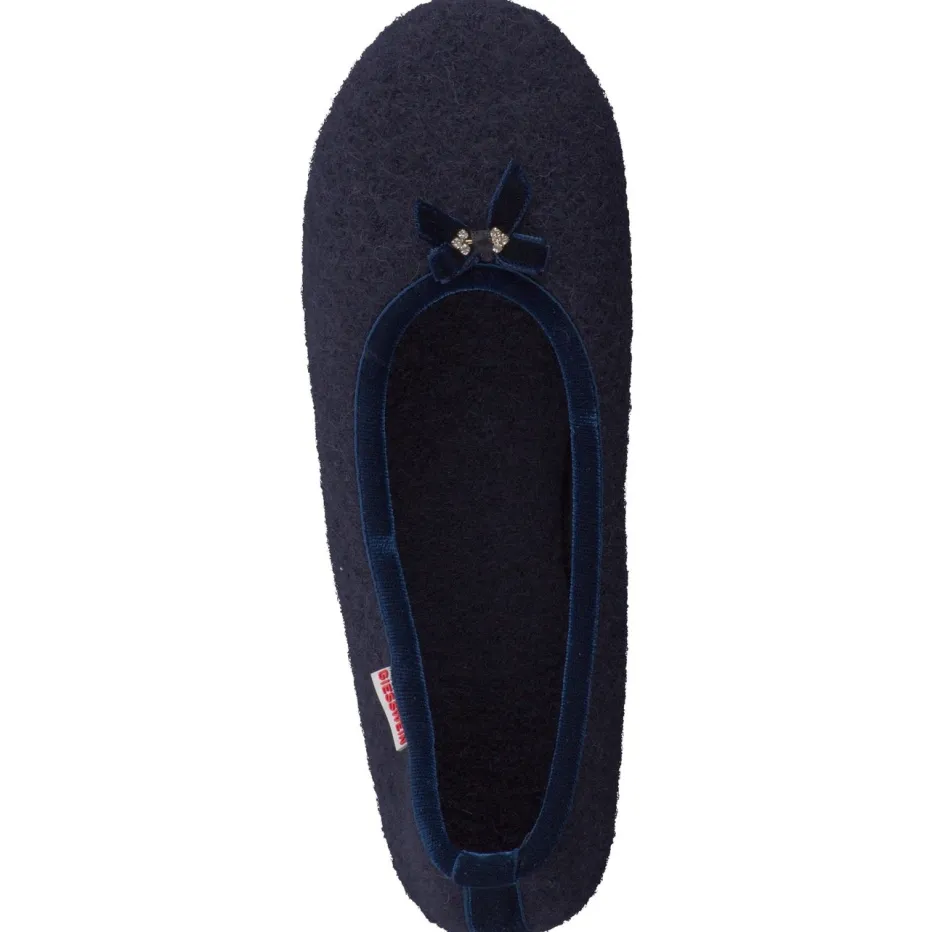 Femininer Komfort für zu Hause.Giesswein präsentiert mit diesen Ballerina-Hausschuhen ein elegantes Modell für entspannte Tage. Das flache Design aus dunkelblauem Wollfilz überzeugt mit angenehm weicher Haptik und hochwertiger Verarbeitung. Die flexible Gummisohle sorgt für rutschhemmenden Halt, während der Einstieg mit samtiger Paspelierung und einer feinen Schleife samt Perlenbesatz feminin akzentuiert wird. Die klassische Silhouette mit runder Form spiegelt minimalistisches Design und Loungewear-Ästhetik wider. Kombiniert mit Fleecehose oder Kaschmirleggings ergibt sich ein harmonischer Homewear-Look. Giessweins Expertise für stilvolle Wärme steckt in jedem Detail.