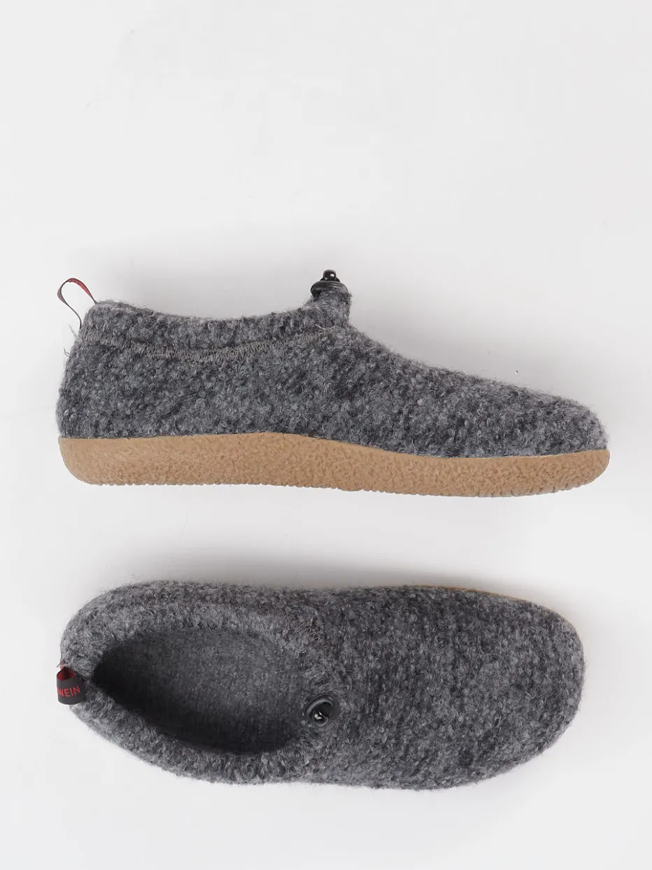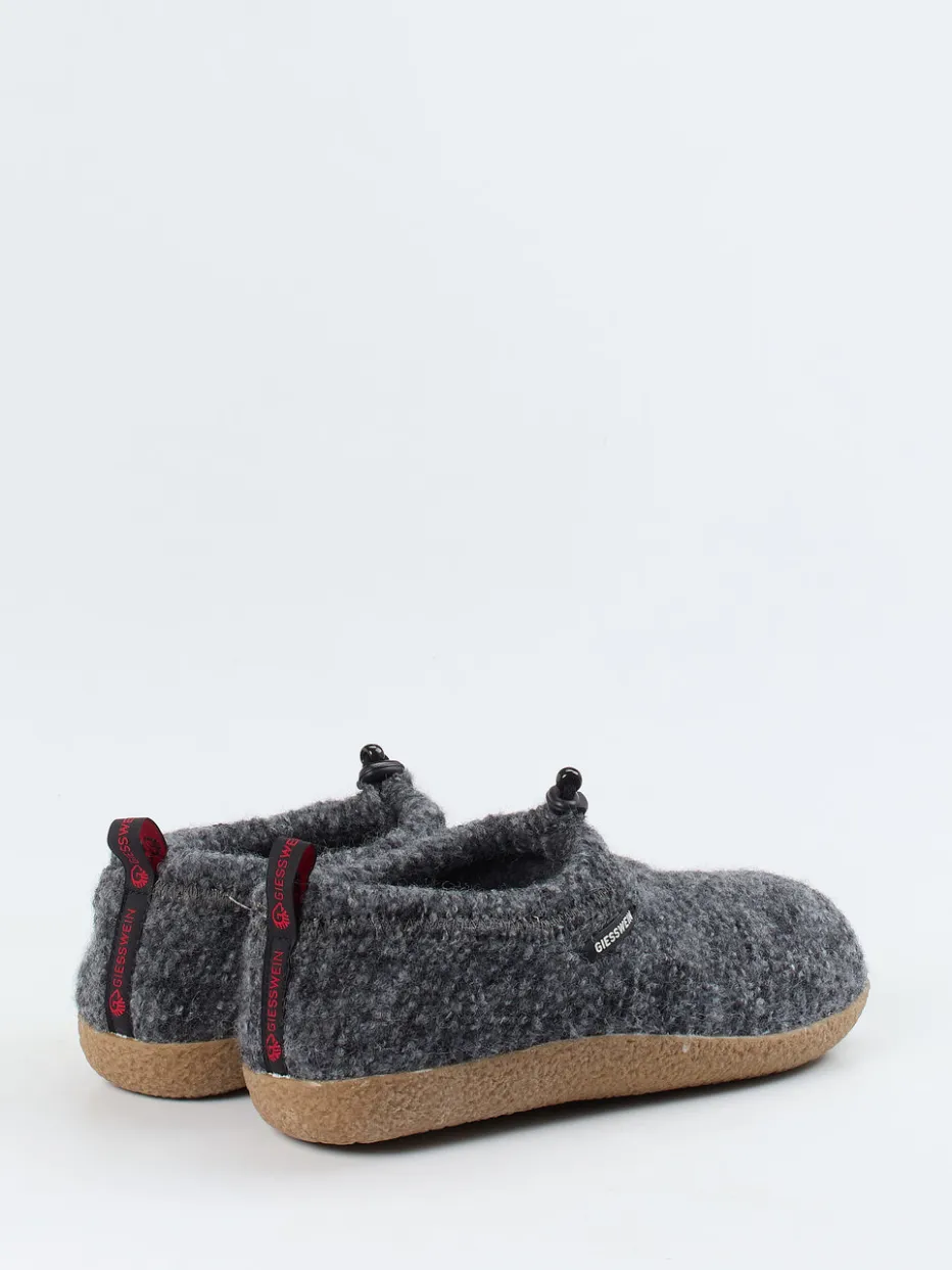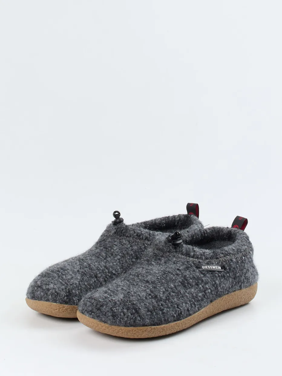 Alpiner Charme, modern interpretiert.Giesswein bietet mit diesem Hüttenschuh ein wärmendes Komforthighlight für entspannte Momente. Für kühle Böden und gemütliche Abende konzipiert, überzeugt das Modell durch atmungsaktiven Wollfilz mit melierter Oberfläche. Die runde, kompakte Form in Anthrazit trifft auf funktionale Details wie den elastischen Kordelzug, eine rote Fersenlasche und das seitlich gesetzte Marken-Label. Die rutschhemmende Naturkautschuksohle ist alltagstauglich und stabilisierend. Inspirieren lässt sich das Design von alpinem Minimalismus mit Cottagecore-Flair. Ideal kombinierbar mit warmem Loungewear oder Wollsocken. Ein durchdachtes Wohlfühlprodukt mit Fokus auf Qualität, Funktion und Stiltypik der Marke.