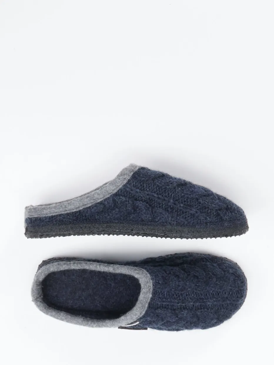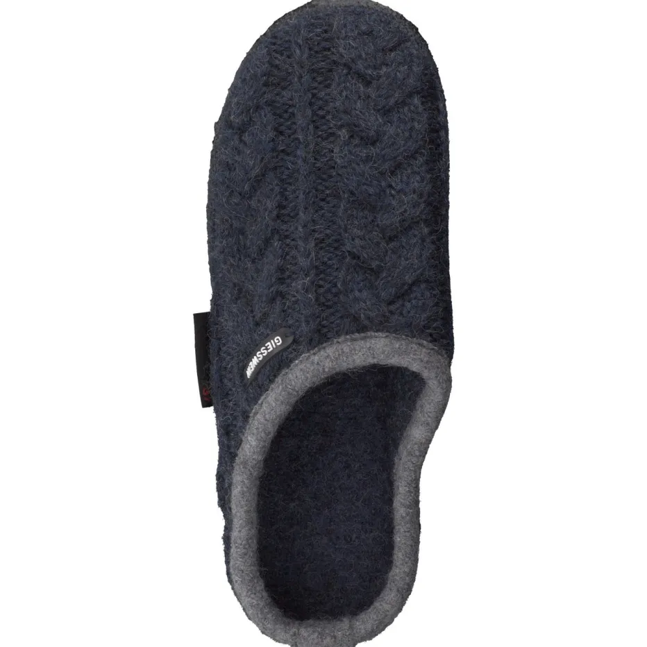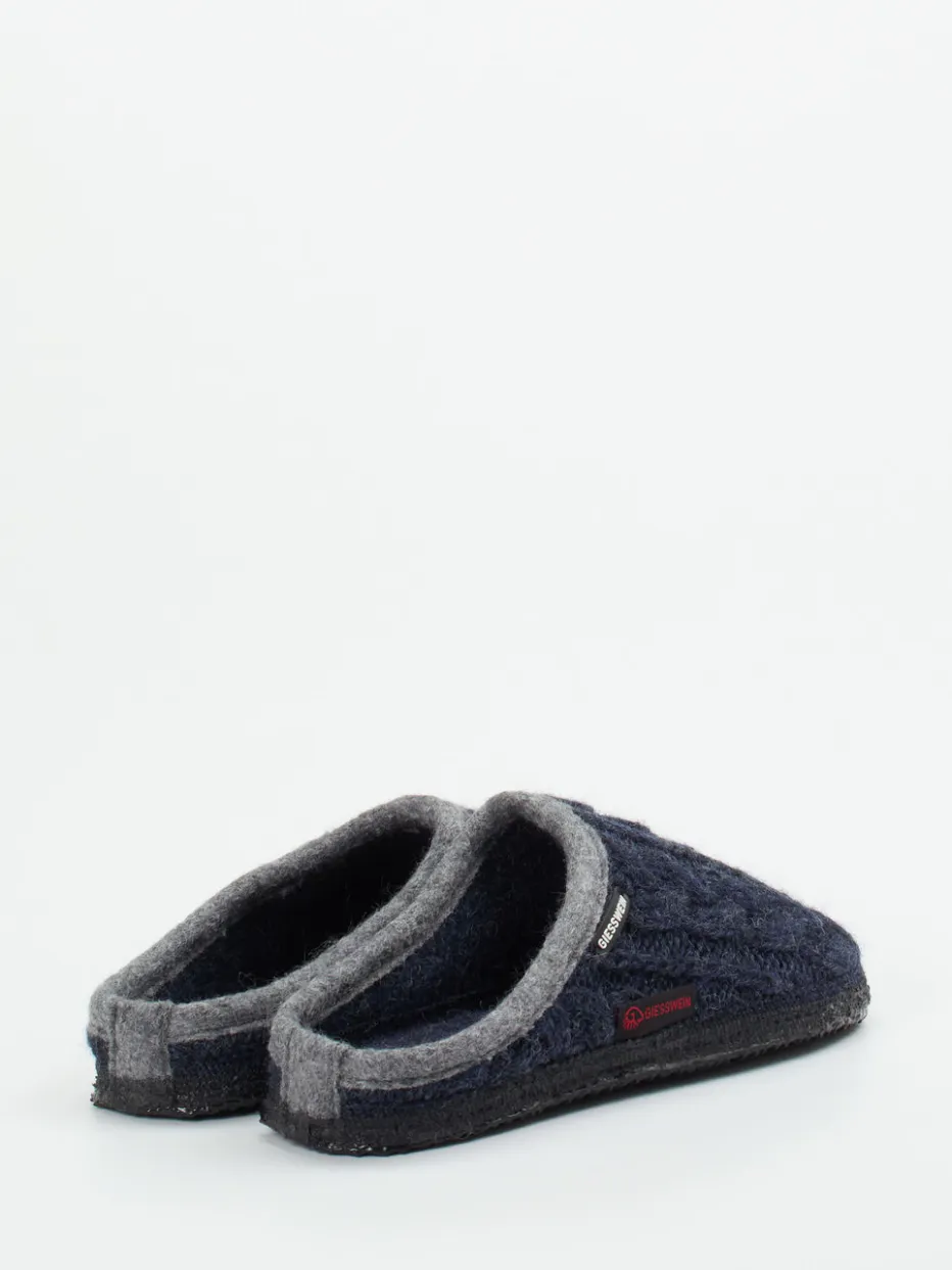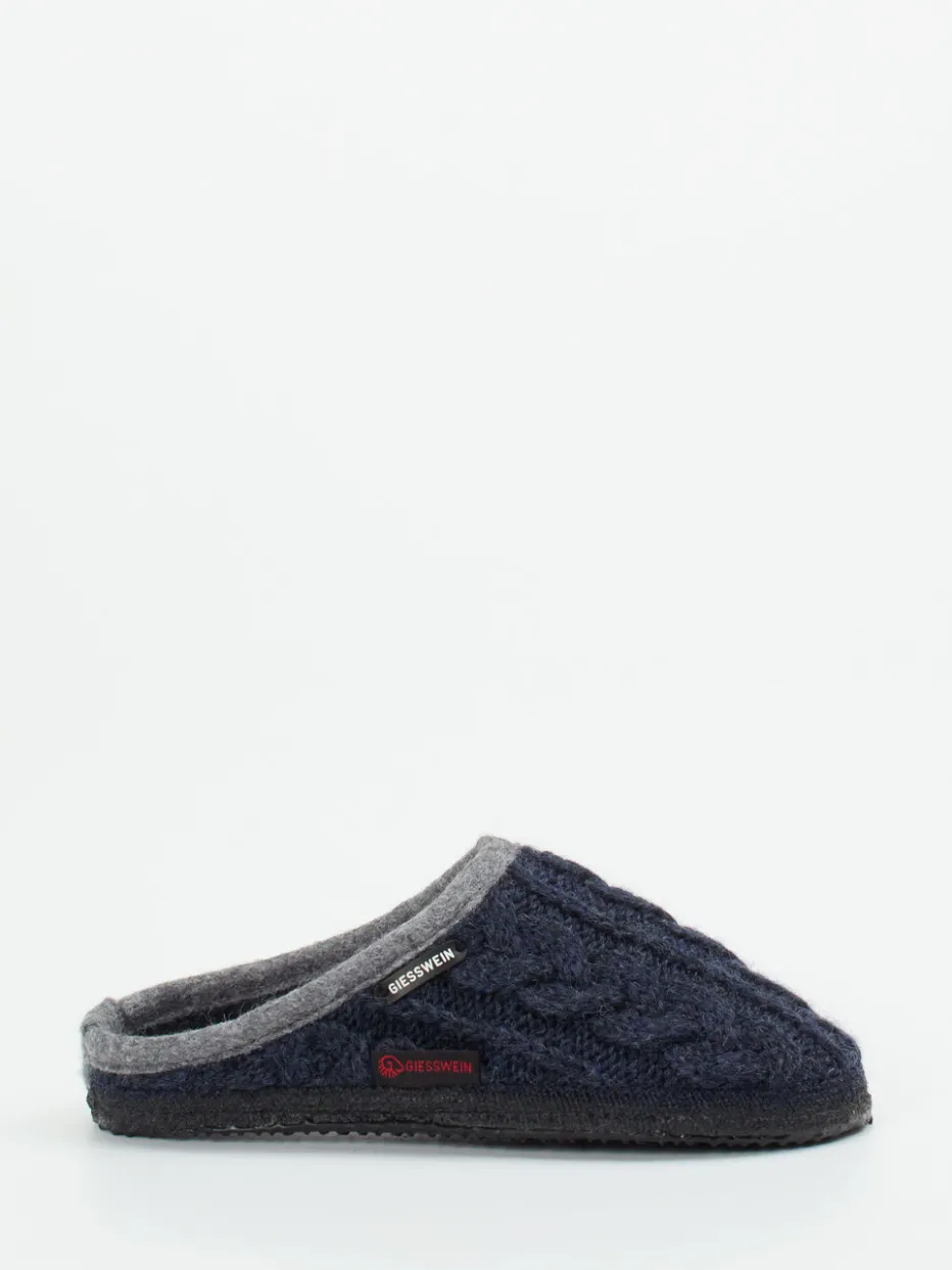 Alpin inspiriert, skandinavisch interpretiert.Die Marke Giesswein präsentiert einen Hausschuh aus reiner Schurwolle für unvergesslich entspannte Stunden daheim. Ob nach einem langen Tag oder an kalten Winterabenden – dieser Pantoffel erfüllt das Bedürfnis nach Wärme und Komfort. Hergestellt aus dunkelblauer Schurwolle mit weicher, wolliger Struktur und klassischem Zopfmuster bietet er ein gemütliches Trageerlebnis. Ein grauer, kontrastfarbiger Filzrand und dezente Ton-in-Ton-Strickdetails runden das Design ab. Die rutschhemmende Gummisohle mit Naturkautschukbeschichtung sorgt für Stabilität. Inspiriert von Scandi-Cosiness und alpiner Tradition, ideal für Loungewear-Momente. Besonders stimmig in Kombination mit kuscheligen Wollsocken. Wärmender Hausschuhkomfort – markentypisch Giesswein.