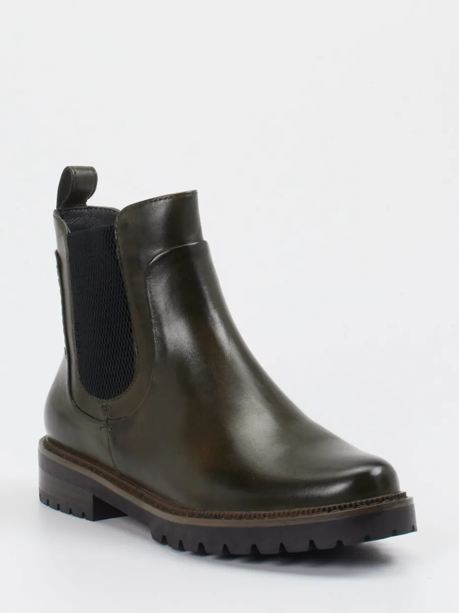 Robuster Stil für kühle Tage.Ginger & Glove interpretiert den Chelsea Boot als moderne Damen-Stiefelette mit klarem Design. Ideal für wechselhafte Herbsttage im Alltag oder im Büro vereint dieser knöchelhohe Schuh minimalistischen Stil mit hohem Tragekomfort. Das fein glänzende Lammleder in Dunkelolivgrün wird durch einen seitlichen Elastikeinsatz und einen verdeckten Reißverschluss ergänzt. Eine profilierte Gummisohle sorgt für Trittsicherheit bei jedem Wetter. Die Ton-in-Ton-Nähte und Zuglasche unterstützen die klare Linienführung. Besonders passend zu Wollmantel oder Strickkleid für entspannte City-Looks. Markentypisch souverän und urban durchdacht.