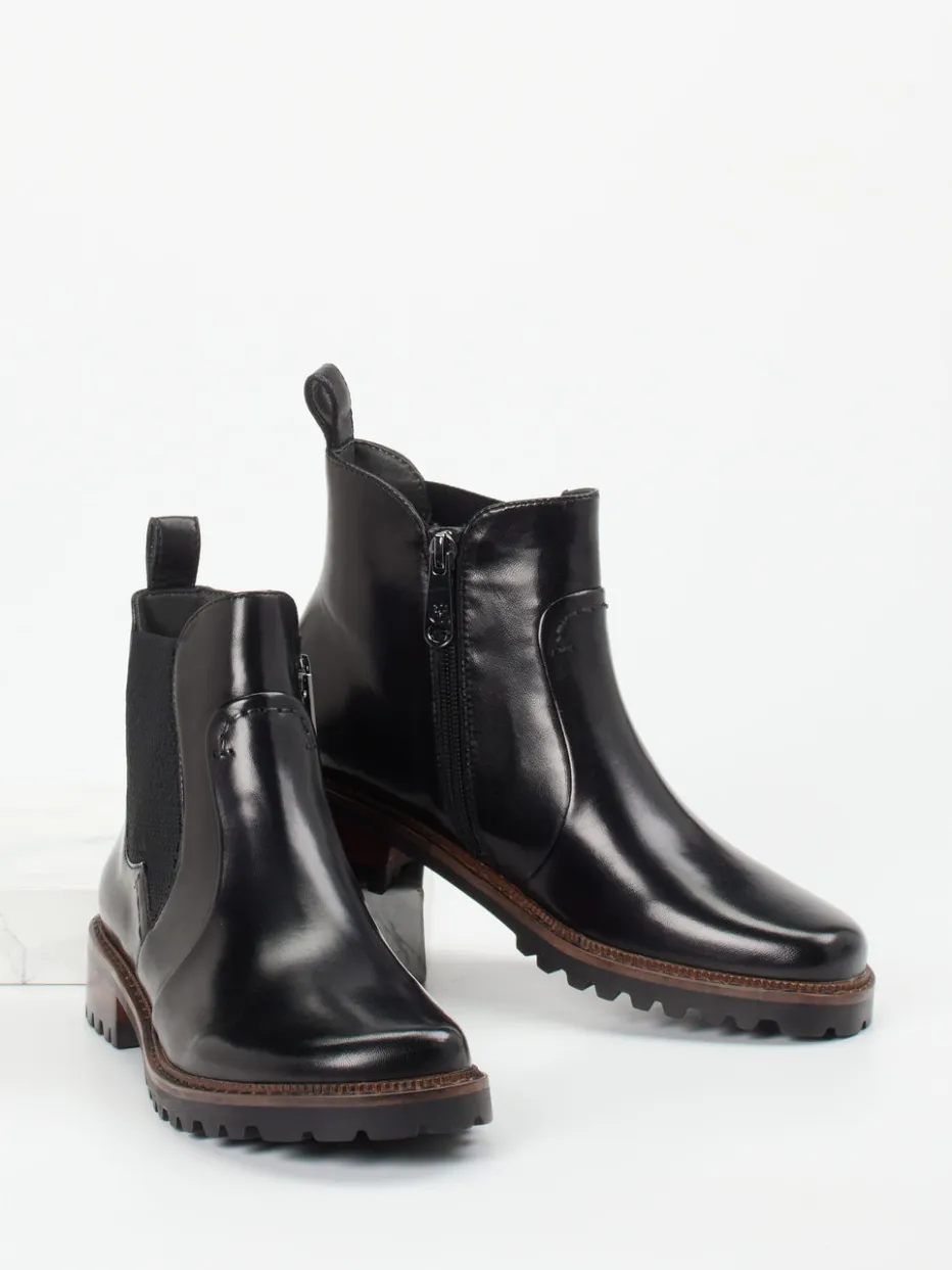 Stilvolle Wahl für kalte Tage.Ginger & Glove interpretiert klassische Chelsea Boots auf moderne Weise. Für den täglichen Stadtbummel ebenso wie für einen klassischen Office-Look bieten diese Damen-Stiefeletten zuverlässigen Komfort. Gefertigt aus hochwertigem, glänzendem Lammleder in tiefem Schwarz verbinden sie minimalistisches Design mit funktionalen Details wie dem seitlichen Elastikeinsatz und einem Reißverschluss. Die knöchelhohe Silhouette wird ergänzt durch eine dunkelbraune Zwischensohle mit Blockabsatz und markanter Profilsohle – ein Hinweis auf den Herbst-Trend „Heavy-Sole“. Der warme Fleeceschaft eignet sich ideal für kühle Tage. Zu kombinieren mit Mänteln, Strick und Ledertasche. Hervorragende Verarbeitung trifft auf alltagstaugliche Eleganz.