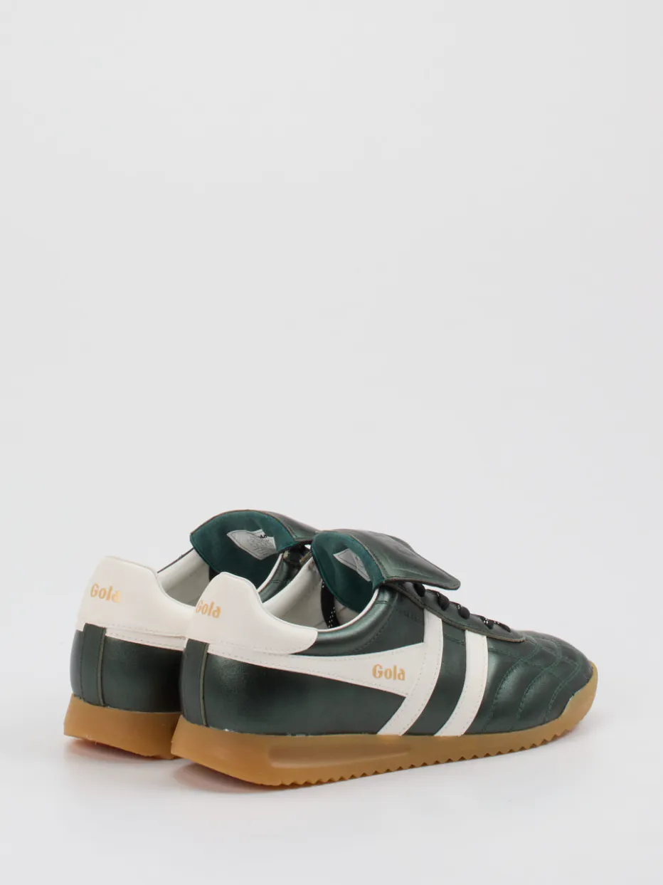 Sportstil mit Vintage-Flair.Gola präsentiert diesen Unisex-Sneaker als Tribut an klassische Fußballsilhouetten. Ideal für urbane Looks mit sportlichem Twist: Das glänzende Leder in Dunkelgrün wird durch weiße Kontraste und eine profilierte Gummisohle im hellbraunen Gum-Look akzentuiert. Die flache, schmale Passform und die markante Zunge mit Überschlag unterstreichen den Retro-Charakter, während die Steppnähte im Vorderfußbereich dezente Struktur geben. Innen sorgt ein weiches Lederfutter für angenehmen Tragekomfort. Das Modell zitiert den aktuellen Retro-Soccer-Trend und lässt sich ideal zu Trackpants oder Streetwear kombinieren. Markentypische Designelemente treffen auf modische Authentizität mit sporthistorischem Charakter.