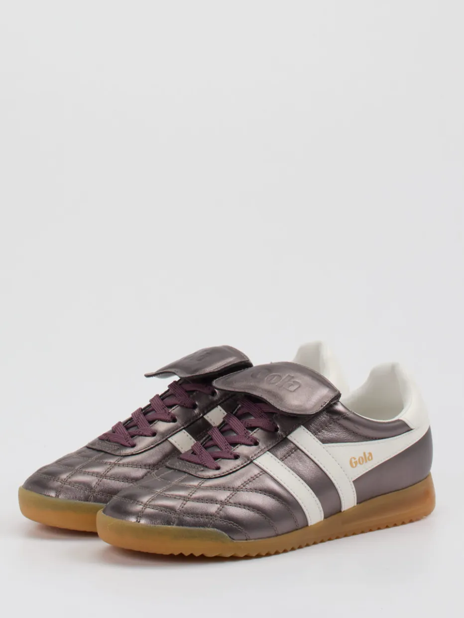 Retro-Look trifft glänzenden Auftritt.Gola präsentiert mit diesem Retro-Sneaker ein modisches Highlight für Alltag und Party. Die Kombination aus Leder und glänzender Metallic-Textur in Violettgrau erzeugt einen markanten Blickfang. Die flache, runde Silhouette mit profillierter Gummisohle sowie die Schnürung unterstreichen das Vintage-inspirierte Design. Details wie der goldfarbene Logo-Print und das Branding auf der Zunge verweisen auf eine starke Streetwear-Verankerung mit Retro-Fußball-Flair. Farbkontraste in Cremeweiß und Bordeaux sorgen für visuelle Tiefe und akzentuieren den Unisex-Charakter. Besonders cool zu Jeansjacken und Metallic-Bags. Ein Sneaker mit Ausdruck für individuelle Styles – Gola-typisch progressiv gedacht.