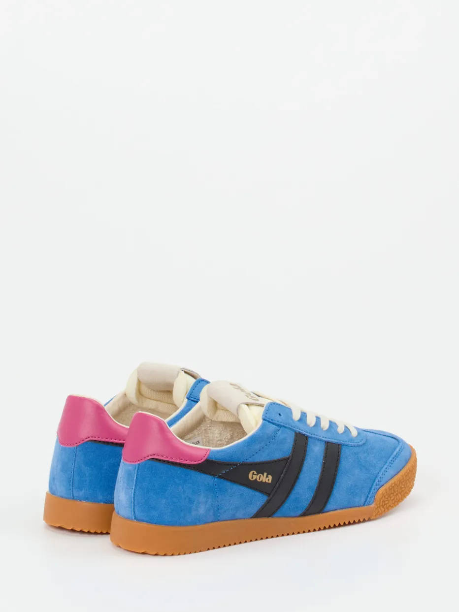 Farbstarker Alltagsbegleiter für Individualisten.Gola zeigt mit dem Retro-Sneaker Elan ein Modell, das urbanen Stil und hohen Tragekomfort kombiniert. Für stylische Akzente im Alltag sorgt das kornblumenblaue Veloursleder, samtig angeschliffen und kontraststark akzentuiert durch pinke Fersenkappe und schwarze Seitenstreifen. Eine flache, schmale Silhouette trifft auf Streetwear-inspirierte Details wie goldfarbenen Logo-Schriftzug und markantes Profil. Das cremefarbene Innenfutter aus Leder und Frottee sowie ein gepolstertes Wechselfußbett bieten hohen Komfort. Ein angesagtes Fashion-Statement der SS24-Retro-Revival-Trends, vielseitig kombinierbar zu Trackpants oder Canvas-Rucksack. Gola verbindet sportliche Tradition mit progressivem Designanspruch.